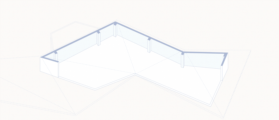 结合场地的几何轮廓,我们在原本沦为堆放施工废料的场地现状中引入固定的三角模数系统,形成连续均质又可多变的单元空间。这个系统顺应现有场地形态、丰富空间层次、塑造曲折多变的展览流线的同时,也为短期施工提供了高效简洁的空间定位方式。
