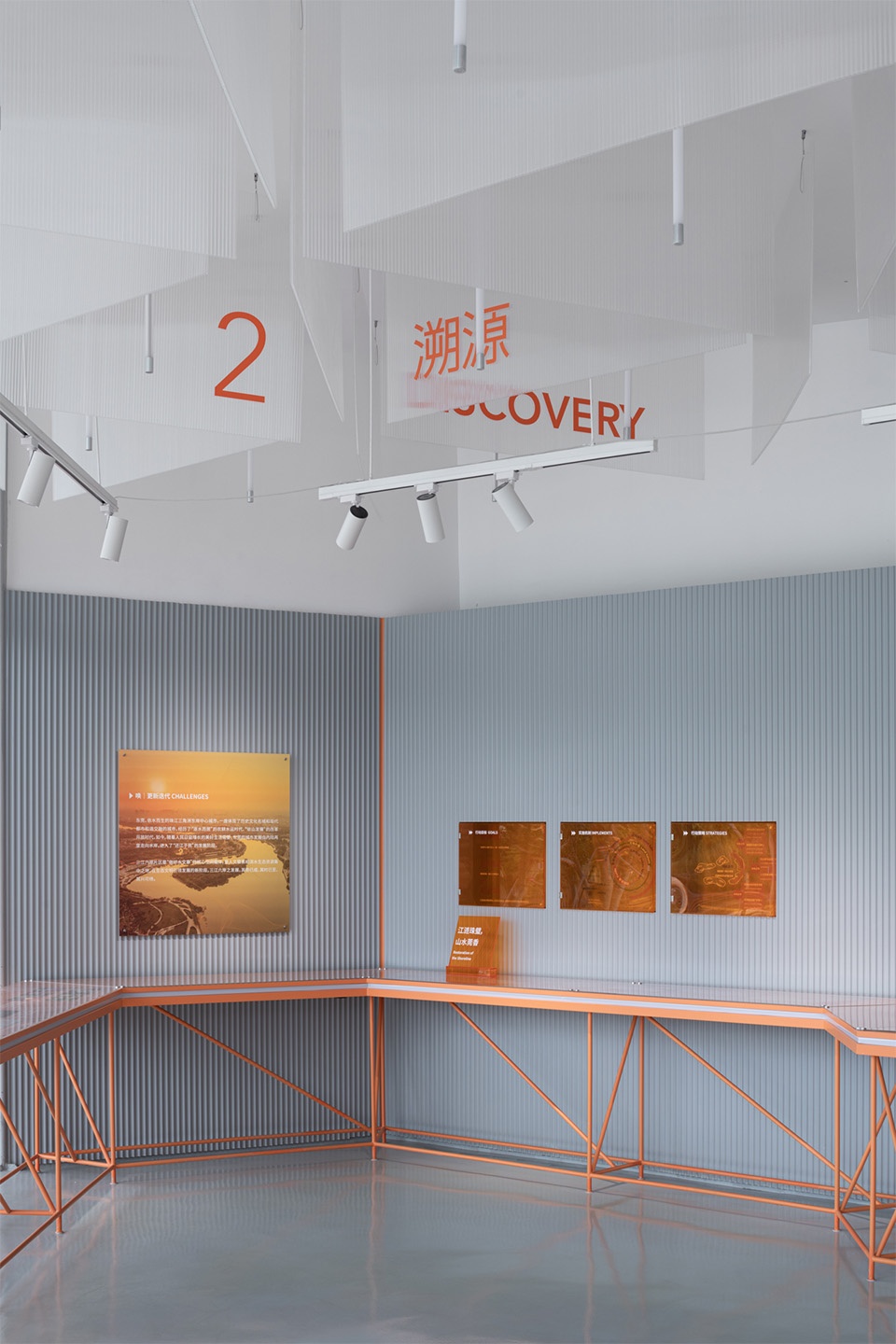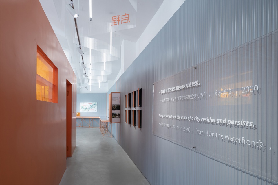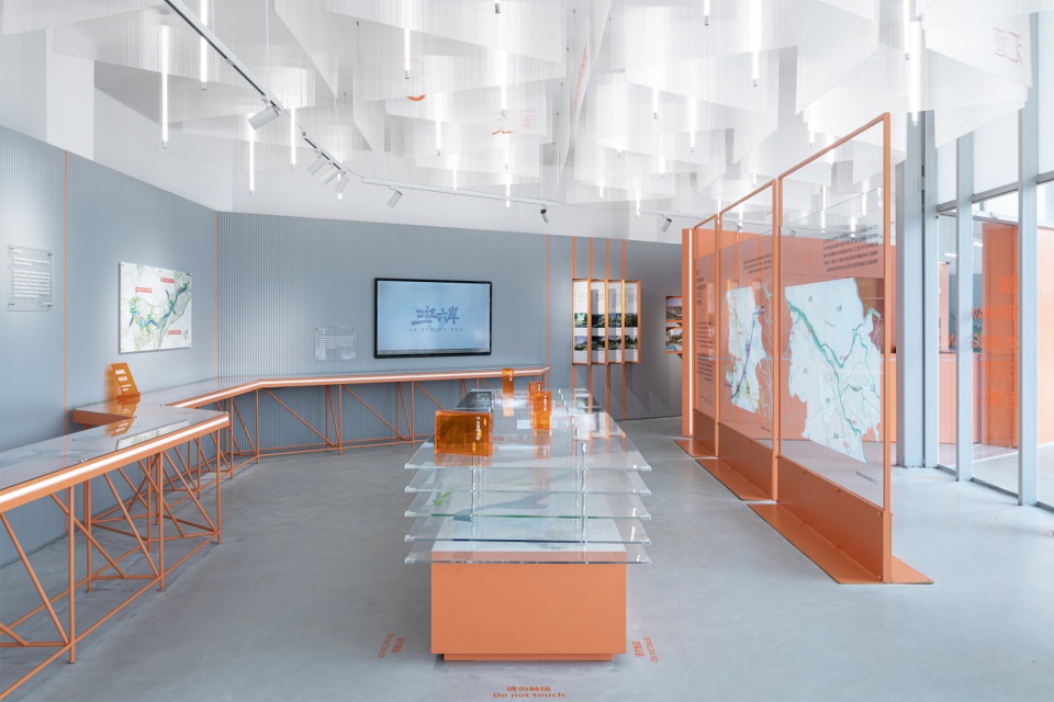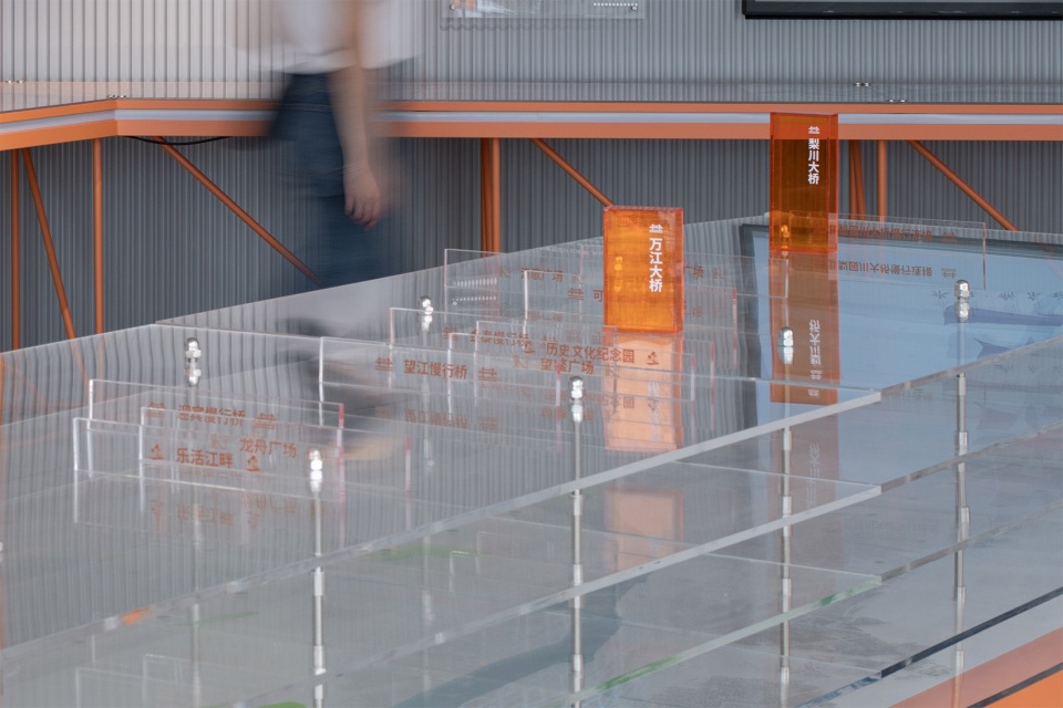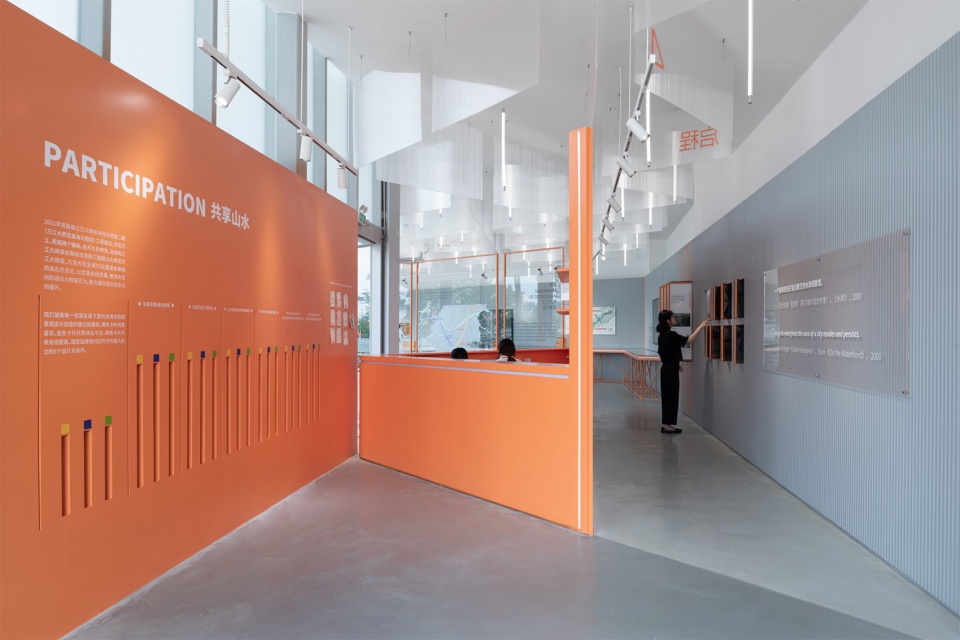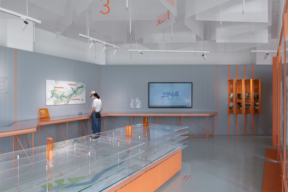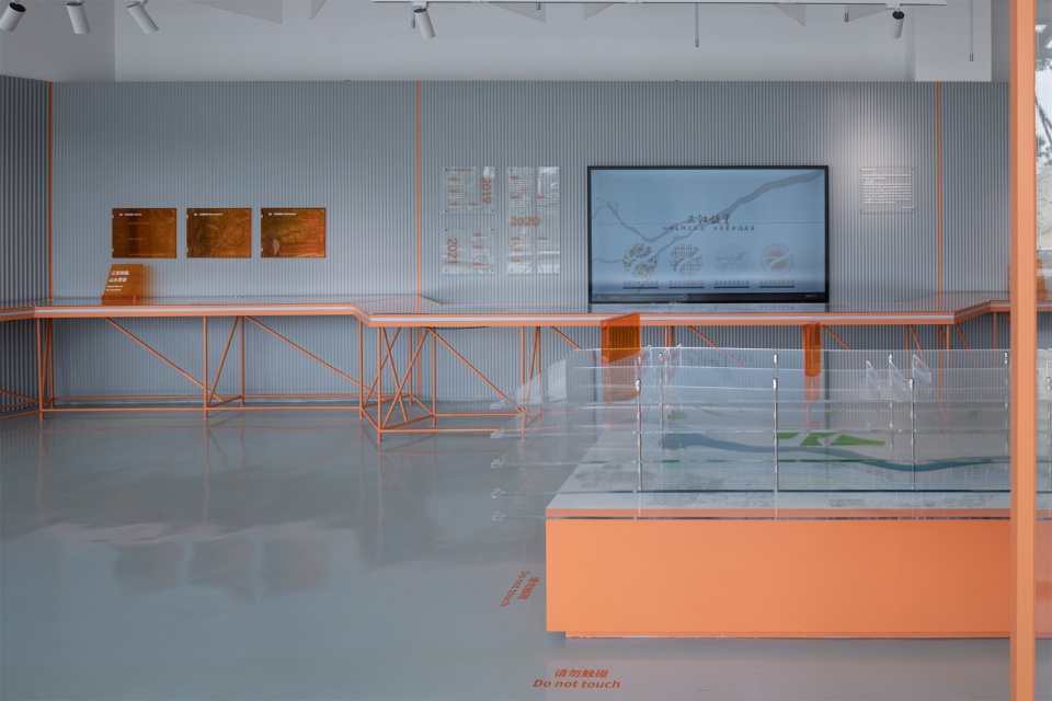 展陈整体色彩以橙色为主,呼应龙湾滨江的基调。长桌展台模拟岸线蜿蜒形态,串联展览叙事。展墙则采用灰色波纹木板,达到控制成本并强化连续性的效果,同时与场地背景形成反差,进一步凸显展览内容。不同尺寸的亚克力图版与装置也构成了开放明快的展览信息界面。