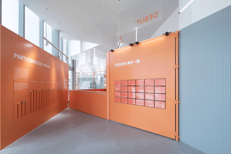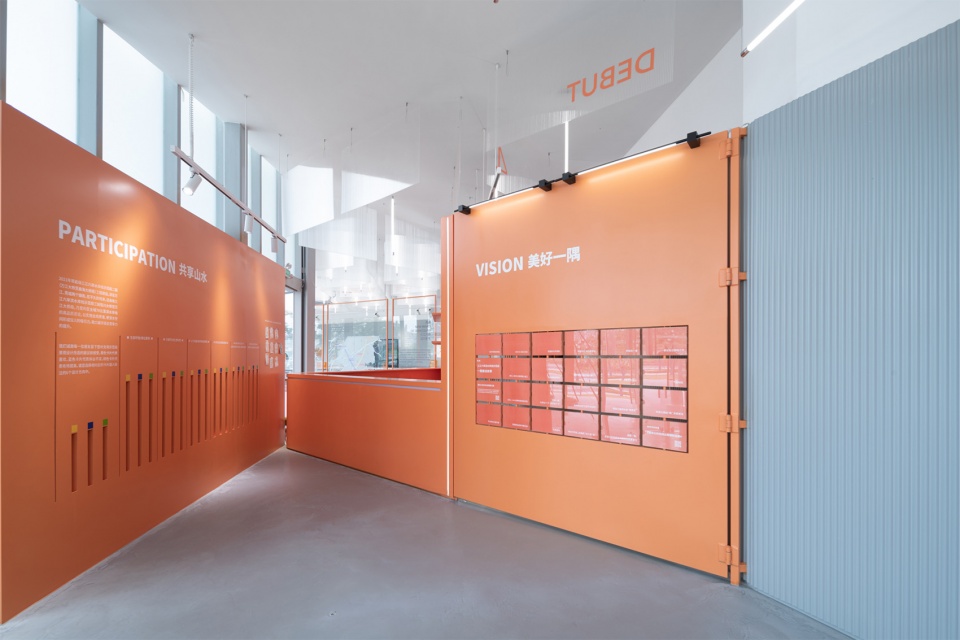 The overall color scheme of the exhibition hall is primarily orange, echoing the tones of Longwan’s waterfront. Long table displays simulate the meandering form of the shoreline, weaving together the exhibition narrative. The backdrop walls are designed with gray spray-painted corrugated wood panels, achieving cost control while enhancing visual continuity. Additionally, acrylic panels and installations of varying sizes form an open and lively interface for exhibition information.