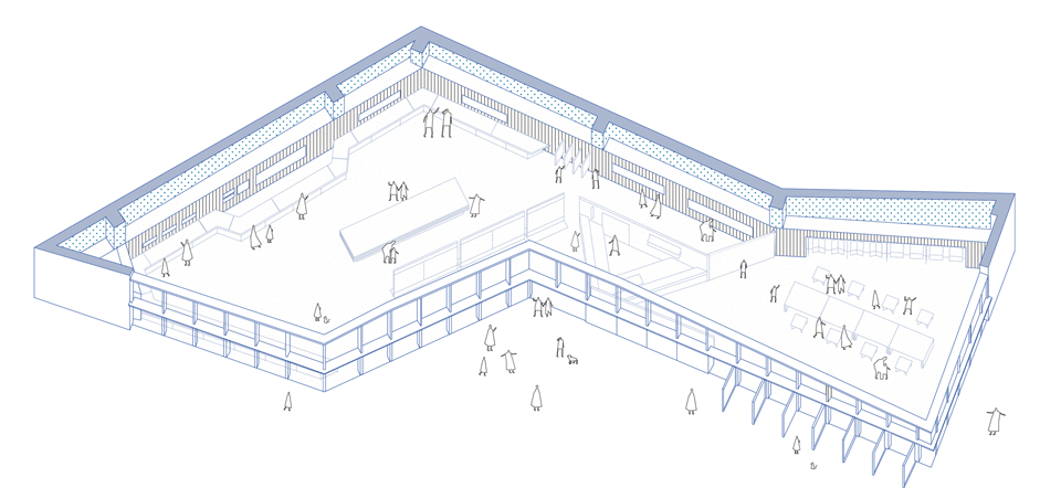 The archive and reading area opens to the public as a city living room. Tables and chairs are designed to be movable, allowing flexible arrangements for various activities while reserving space for interactive installations, and creating a flowing and dynamic spatial atmosphere.