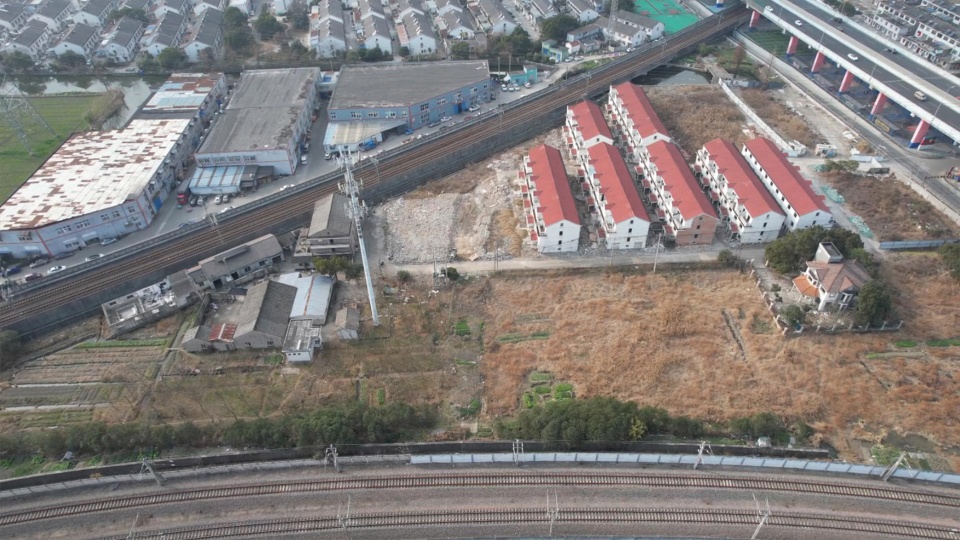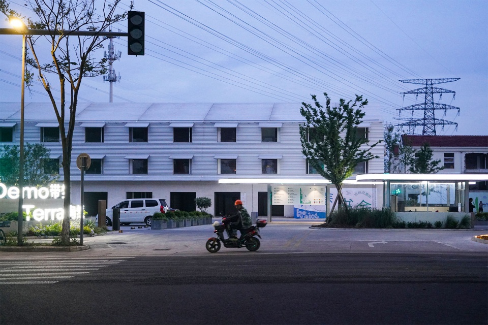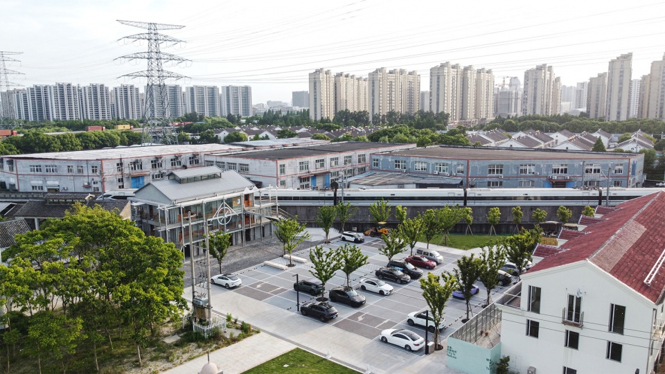 “DEMO TERRA带梦陶然”创意园区位于宁波市鄞州区,虽然地处中心,但由于地块被两条铁路和一条高架道路框定住,仅有一个入口,成了一个人迹稀少的飞地。场地内除了七栋联排别墅和一片小的工厂旧址,大量的是荒地,还留着以前居民种的树和田地。有一个高耸的信号塔矗立其中。只需一个拐弯,就从城市的车流中进入这个场地。突然就看不到城市了,只有铁塔和电线穿过天空,还有时不时传来的火车声。这里,便是城市的旷野。