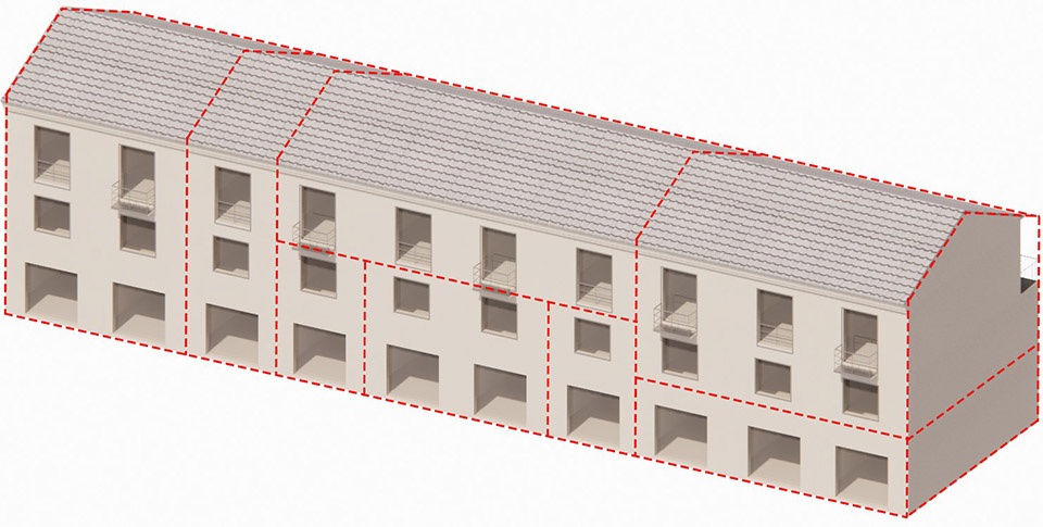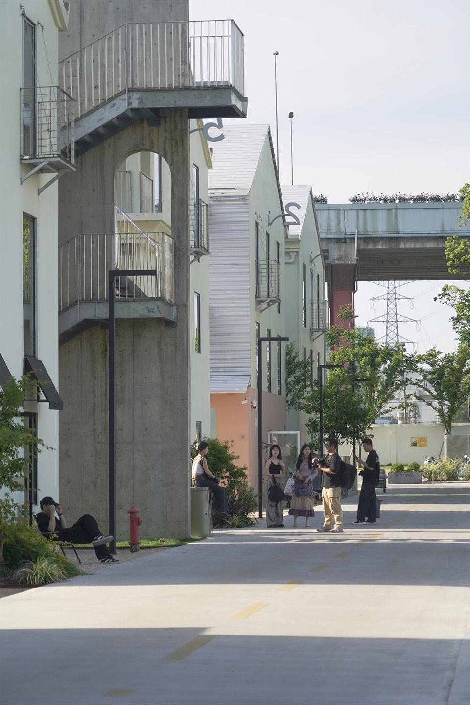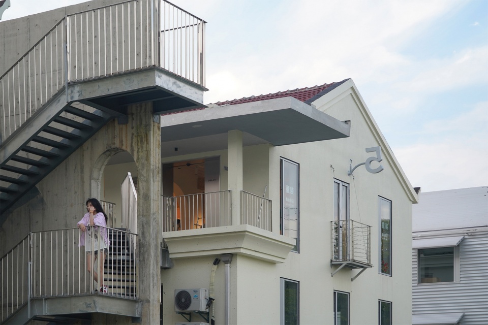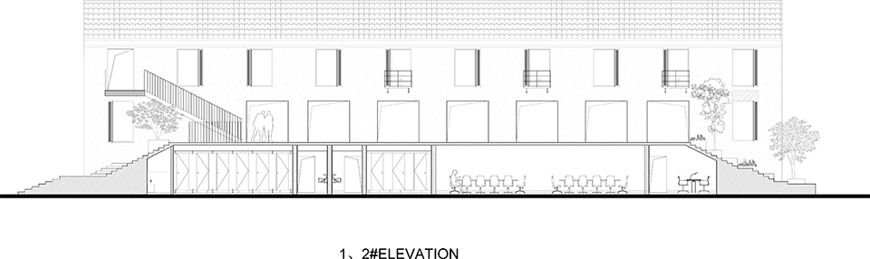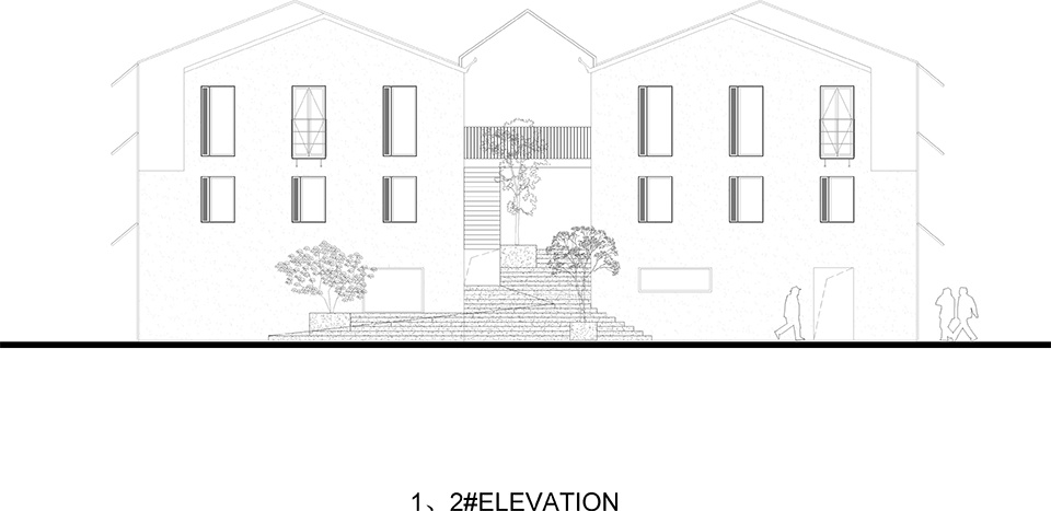 The streets between the villas are divided into front and back streets. The front street provides access to the residents’ entrances, while the back streets are divided into courtyards for each unit. Besides the second-floor platform between Buildings No. 1 and No. 2, we also built a skybridge between Buildings No. 5 and No. 7, connecting the third floors and providing a view of the large lawn to the east. Facing the lawn, we designed a winding staircase that offers a vertical connection to interact with the lawn.