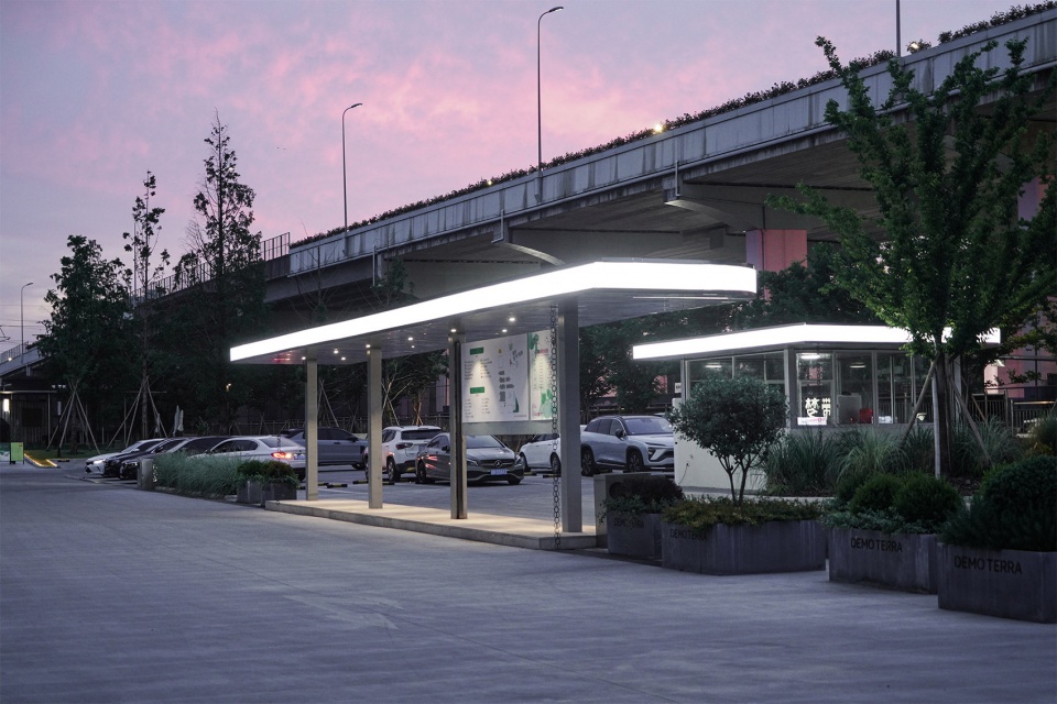 在入口处,我们设置了一个站台,结合门卫的岗亭,都采用了灯带描边,由于停车场的空旷,两个亭子显得格外孤单。尤其在夜晚,哪怕人群聚集,依然给人一种霍普画作中的疏离感。