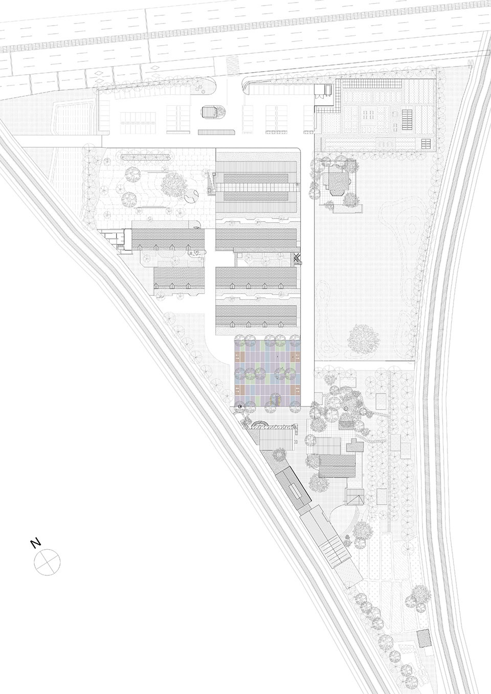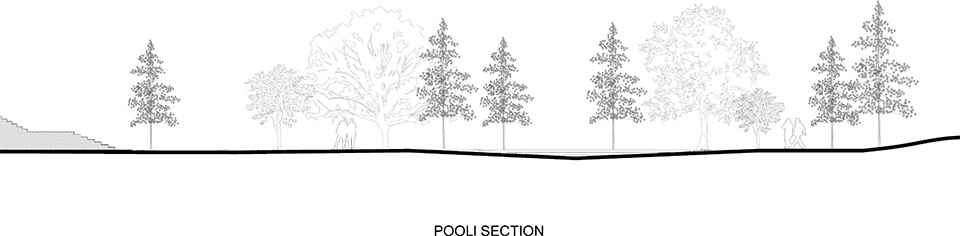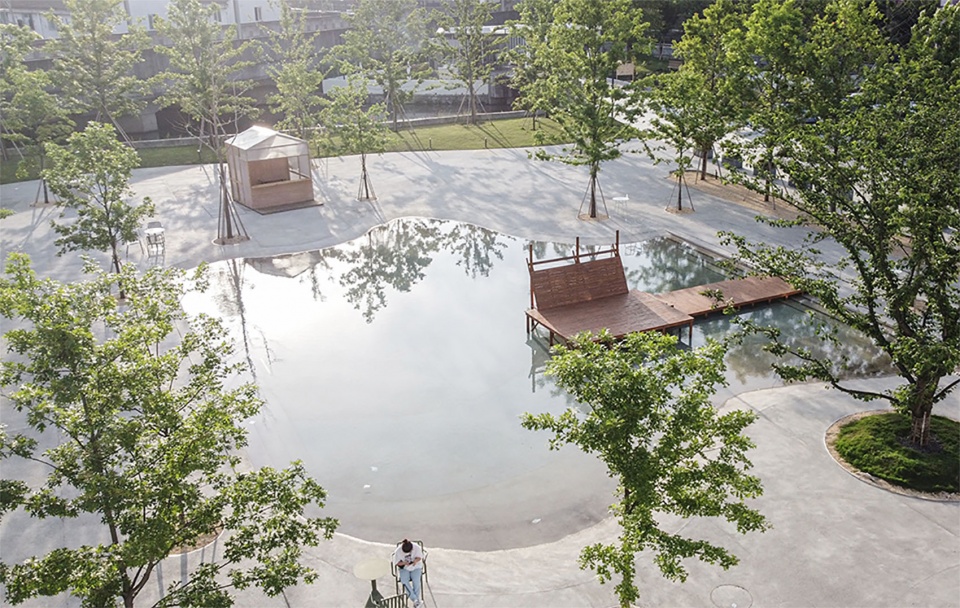 进入后是雨水广场,中心位置我们设计了一个与场地融为一体的水池。广场有着自然的曲线,缓缓下凹,像是盛放雨水的盒子。它会自然的涨落,自然的干涸。有时候又会分成两个池子,水从一个流向另一个。浅浅的,人们可以踩进去嬉戏。岸边种了一棵樱花树,还有几棵散落的娜塔莉,打散了人们的动线,让我们可以有很多舒服的角落,坐在树下,享受一下午。如果放干水,缓缓的斜坡像是蓬皮杜门前的广场,有集市、有聚会,有三三两两席地而坐的人群。