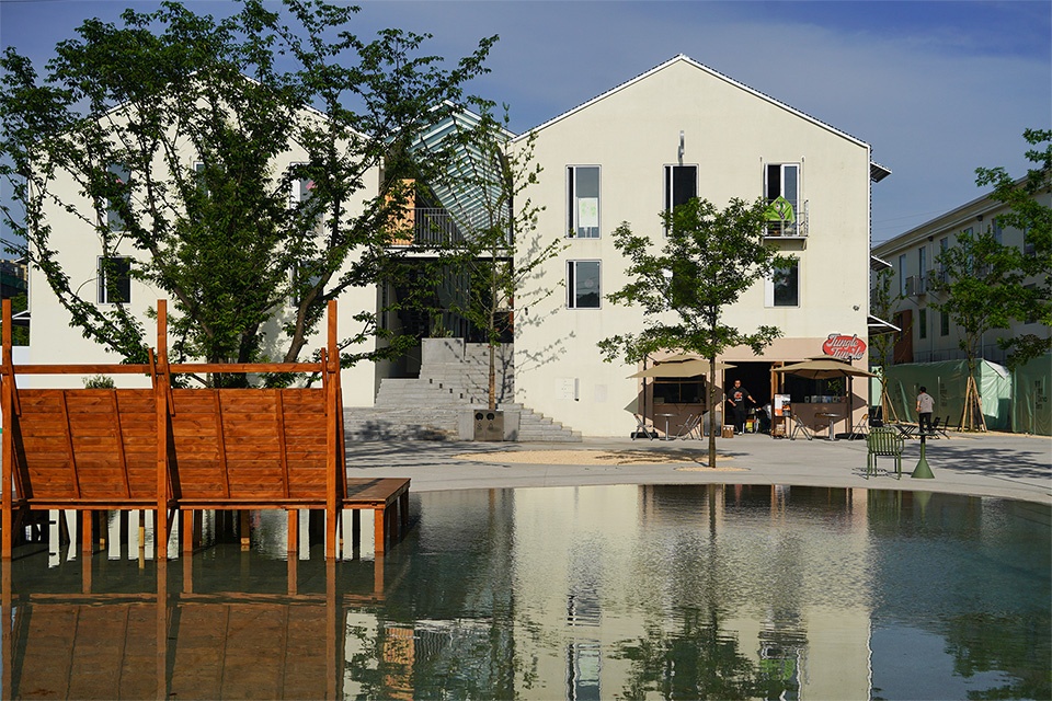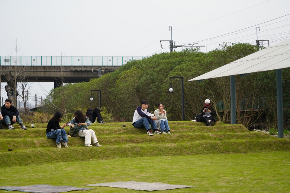 The site was originally a sunken wasteland. We used a large amount of construction debris to create undulating, lazy terrain, then covered it with grass. The large lawn, with its slopes, basins, and platforms, is like a bonsai to adults, but a wonderful playground for children, where they can run freely. With tents set up, visitors can easily lie on the grassy slopes, enjoying the performances and activities at the central stage. On the edge of the lawn stands a detached villa, which we preserved but removed its garden walls, making its ruins and the trees a part of the large lawn.