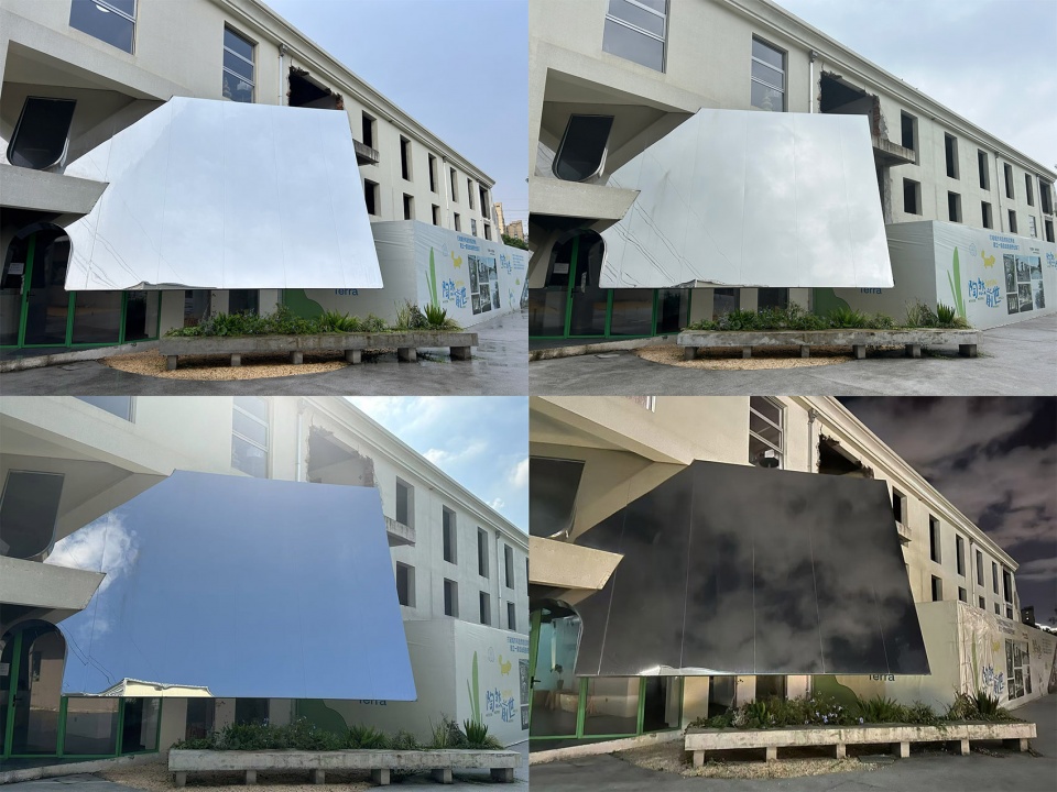 DEMO团队的办公室在雨水广场角上的一户,这个位置对于客人来说,也是进入别墅区的起点。我们设置了一个5*10m硕大的镜面广告牌,不论在哪个位置都可以一眼望见。可以在上面布置最近的活动和信息,像是园区内最响亮的一声呼告。当人聚集在它周围时,它又是一个舞台、一个展台、一个电影幕布。当它空闲时,天光云影,又都能在上面倒映出来。