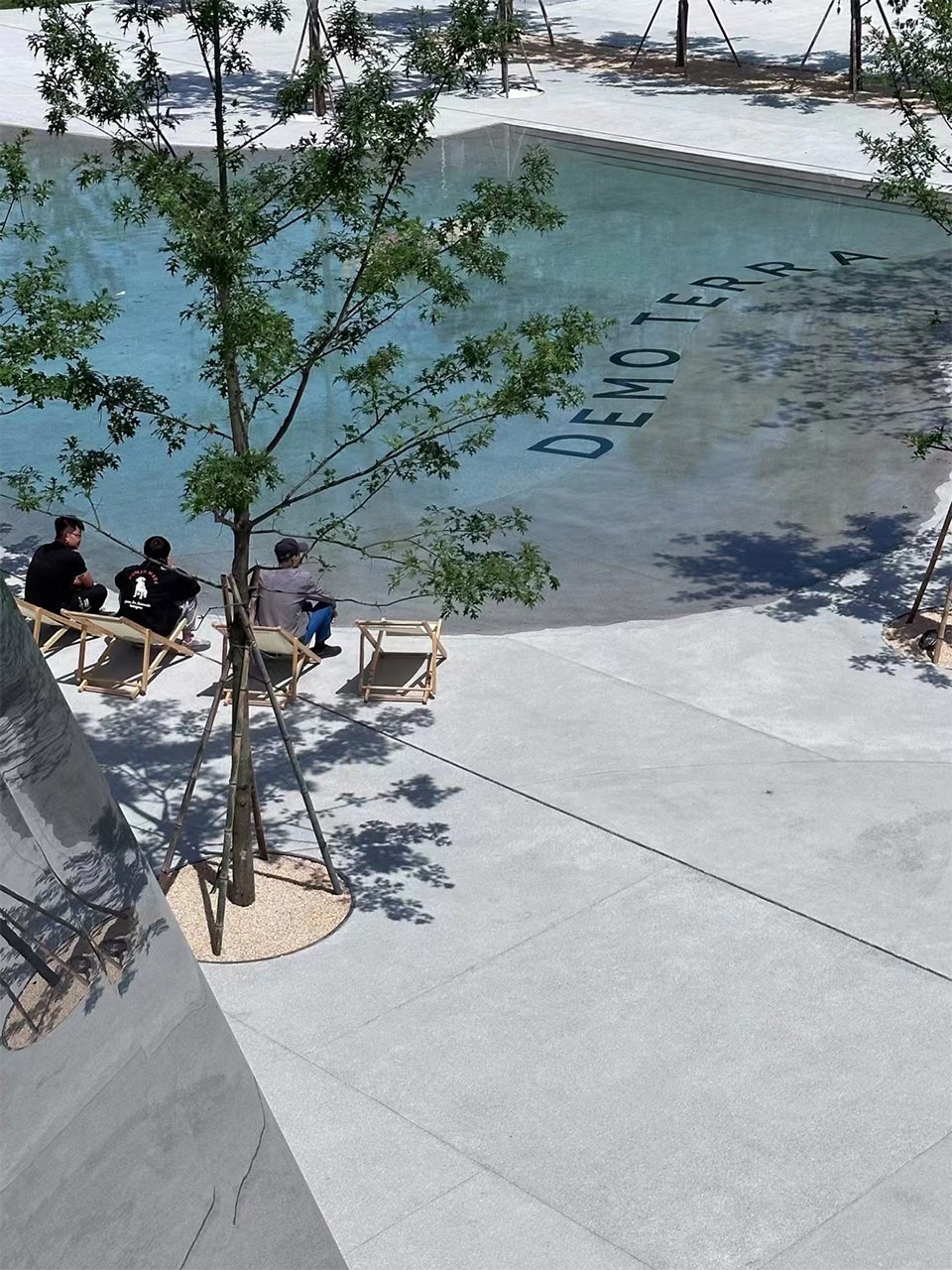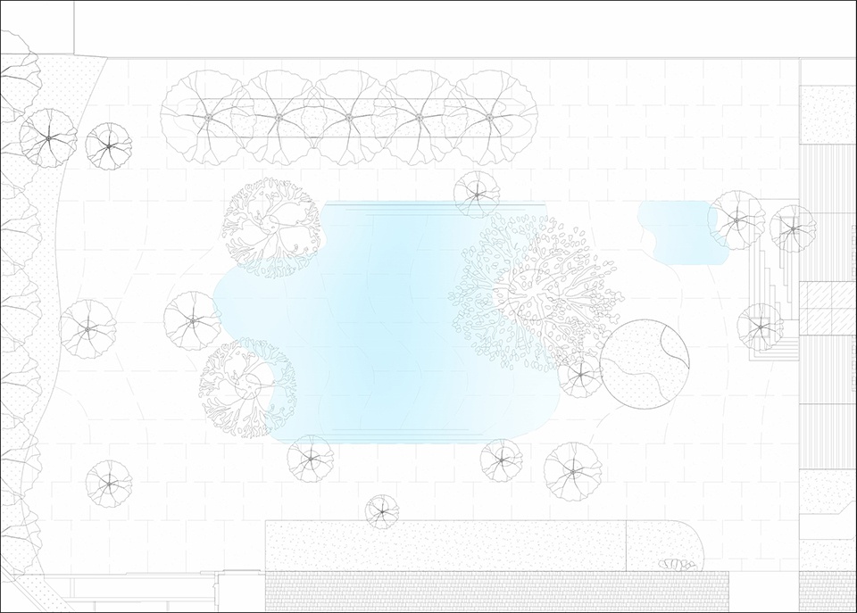 Beyond the entrance lies the Rain Plaza, where we designed a water pool integrated into the site. The plaza has a natural, curving shape, gently sinking as if it were a container for rainwater. The water naturally rises and falls, sometimes splitting into two pools, with water flowing from one to the other. Shallow enough for people to step in and play, it is bordered by a cherry tree and several Quercus nuttallii, which disrupt the flow of movement and create numerous cozy corners. Sitting under the tree, visitors can enjoy a leisurely afternoon. When the water is drained, the gentle slope transforms into a space for markets and gatherings, with people sitting on the ground, like the plaza in front of the Pompidou Centre.