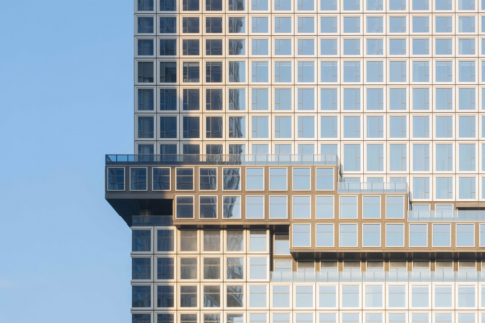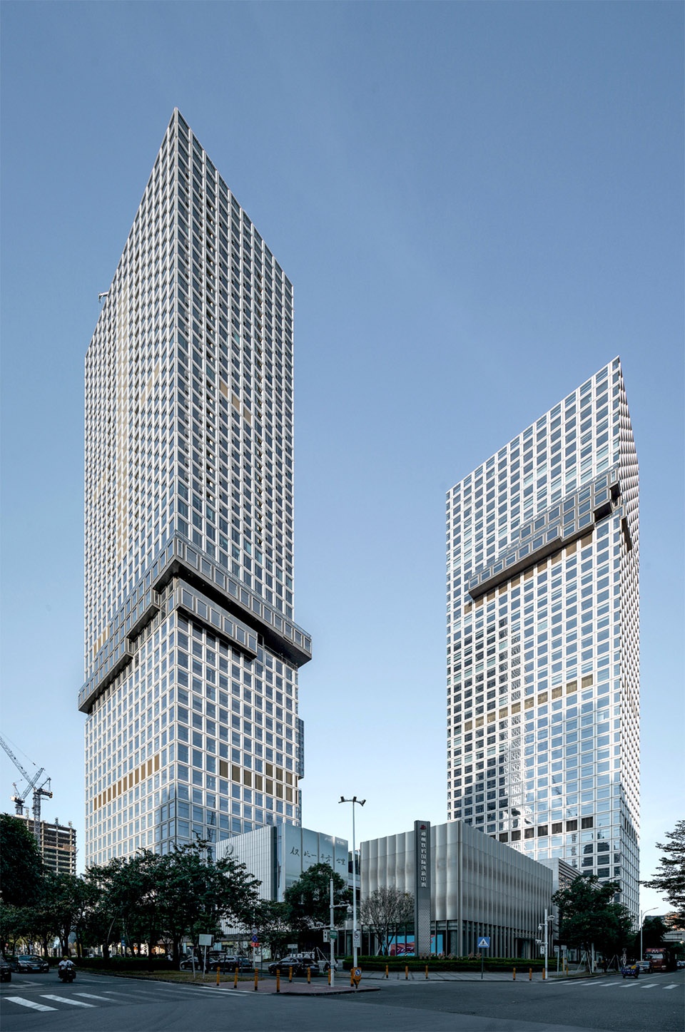 The podium façade conveys a more humanistic narrative. The crackle-glazed ceramic panels reveal ice-crystal-like textures beneath their surface, subtly shifting with changing light and viewpoints. This resonates with the technological expression of the towers while adding warmth and tactility to the building’s base. Complementing this, the pale yellow aluminum grilles provide soft linear textures, further humanizing the scale and enhancing approachability. The dialogue between solid ceramic and voided aluminum enriches the façade’s layered complexity.