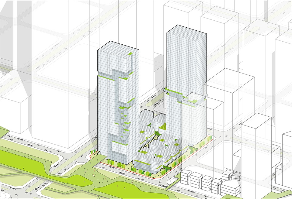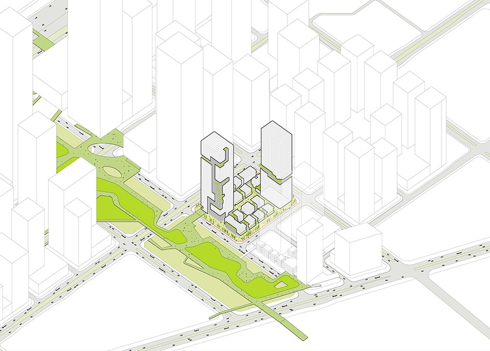 双塔以错动布局主动迎上中央绿轴,层叠的空中露台与退台形成向上延展的绿色界面,犹如绿脉自然攀升,将城市级生态序列引入建筑垂直维度。这一策略不仅延续了片区生态框架,更将场地有机融入城市可持续发展的大脉络之中——建筑不再是孤立的客体,而是与城市共呼吸的生命体,以其立体叠合的生态架构,谱写出一曲自然、建筑与人文共鸣的生态交响,实现从宏观城市到微观场所的生命协同。