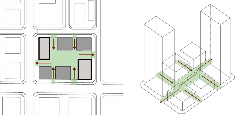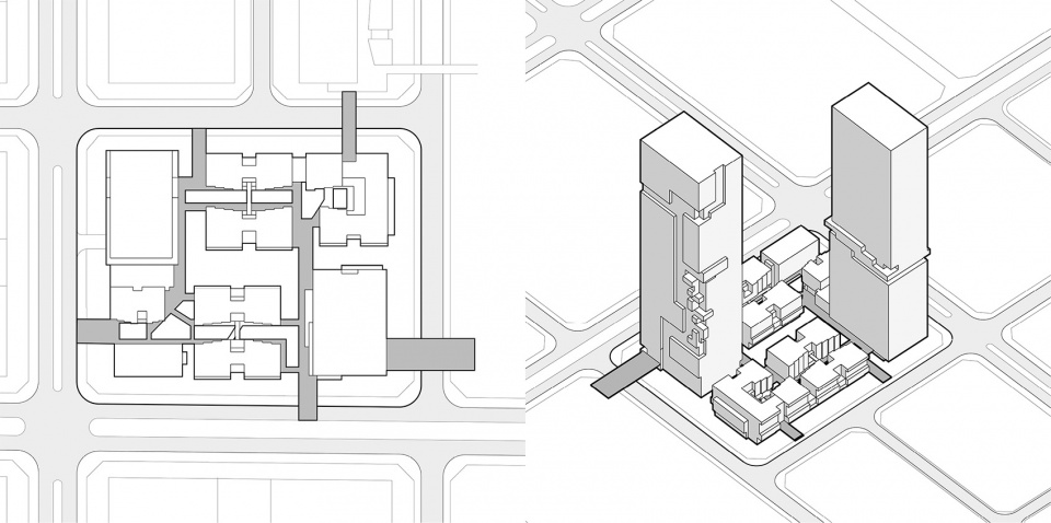 ▼塔楼与底部街巷,Tower and ground-level streetscape