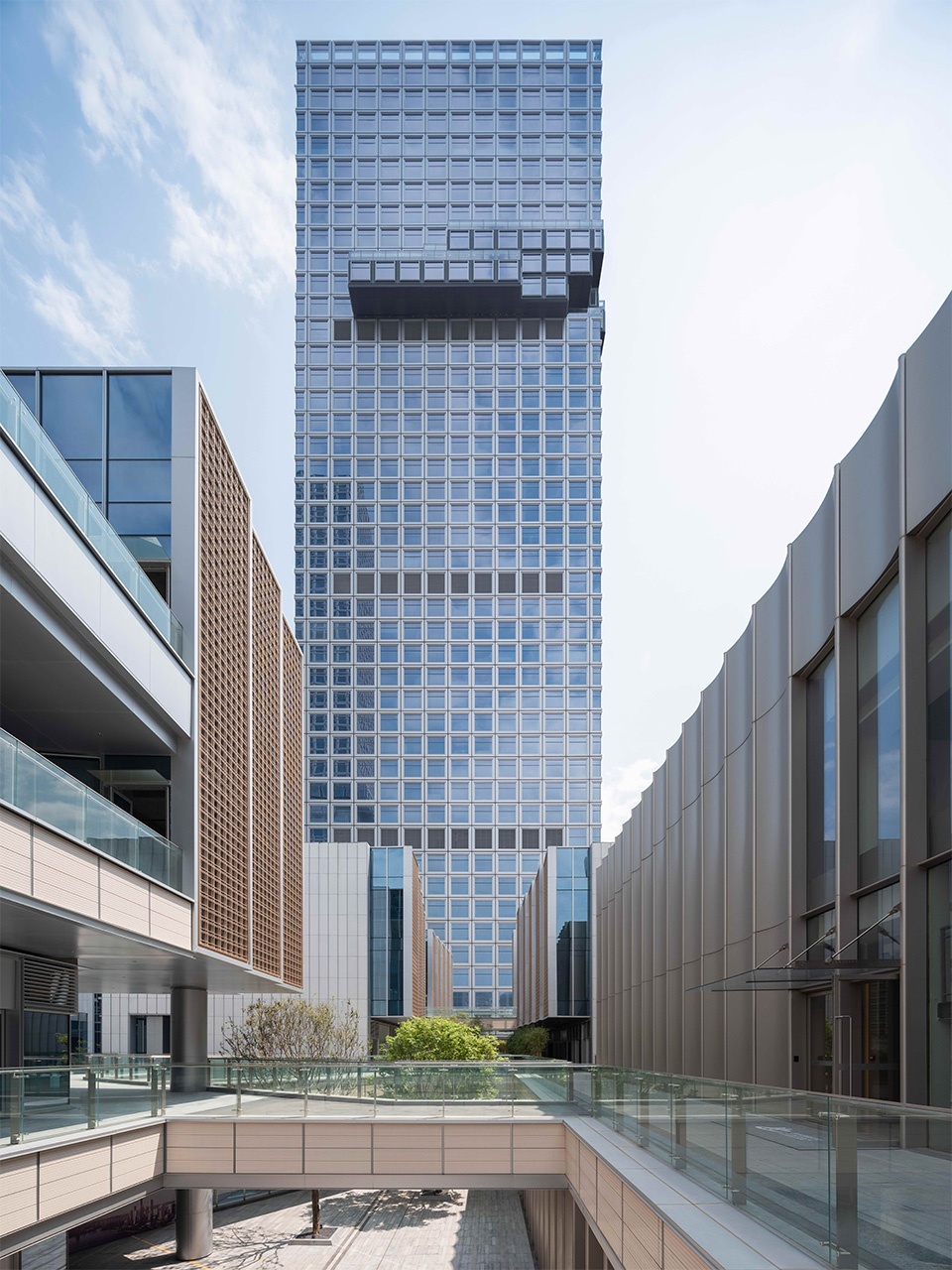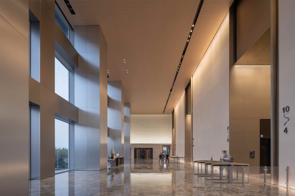 裙房立面的叙事则更贴近人文温度。冰裂纹釉面陶板釉面下冰晶般交织的肌理,在不同光线与视角中呈现细微变幻,既与塔楼的科技感呼应,又为建筑基座注入一抹温润底蕴。米黄色铝格栅以柔和的线性肌理与之搭配,进一步柔化体量、营造更具亲和力的近人尺度环境。陶板的实与格栅的虚形成二次对话,进一步丰富了立面层次。