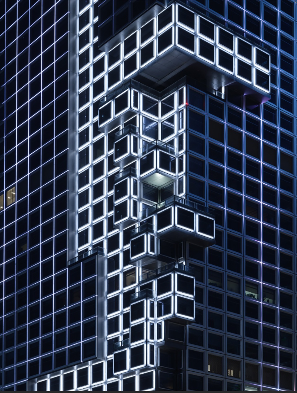 参数化生成的像素单元被转化为立面的基本模数语言。通过标准化4.5米×4.5米的幕墙模块,构建出清晰的结构秩序。这些单元在立面构图中有序排布、叠合与穿插,形成既整体统一又富有变化的韵律节奏,建筑立面形态于理性秩序中诞生诗意律动。塔楼与裙房延续同一模数语言,却又以差异化的像素密度和构图节奏回应各自功能属性——塔楼强调竖向挺拔与科技感,裙房则采用更亲切的尺度与虚实对比。立面不再是静止的表皮,而是承载着秩序与自由、理性与诗意双重基因的动态媒介。