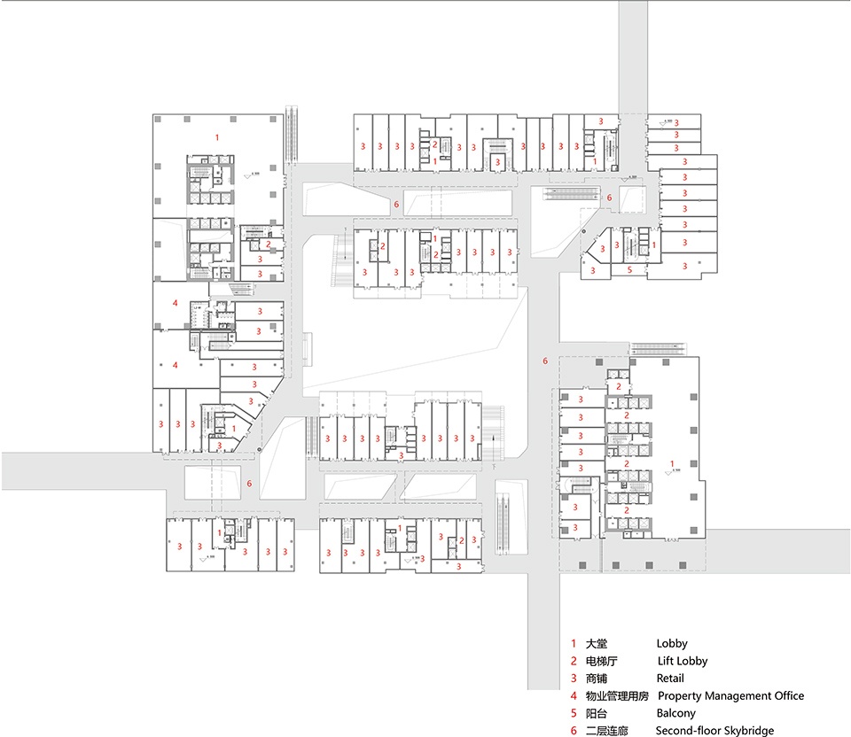 设计以立体叠合的公共空间系统,构建从城市到建筑的多维连接体系。首层通过嵌入口袋公园与蜿蜒街巷,柔化地块边界,使绿意如溪流般漫入城市肌理,形成与中央绿轴及相邻地块的柔性渗透;二层以架空连廊编织出一张充满温度的步行网络,将人群、公园与光影温柔串联,激发区域慢行活力。
