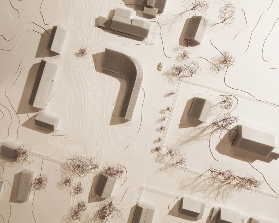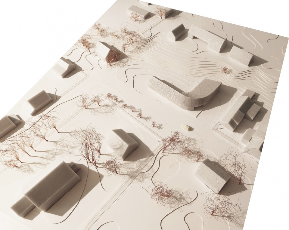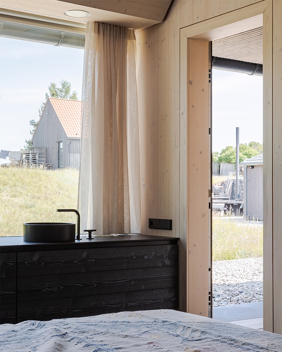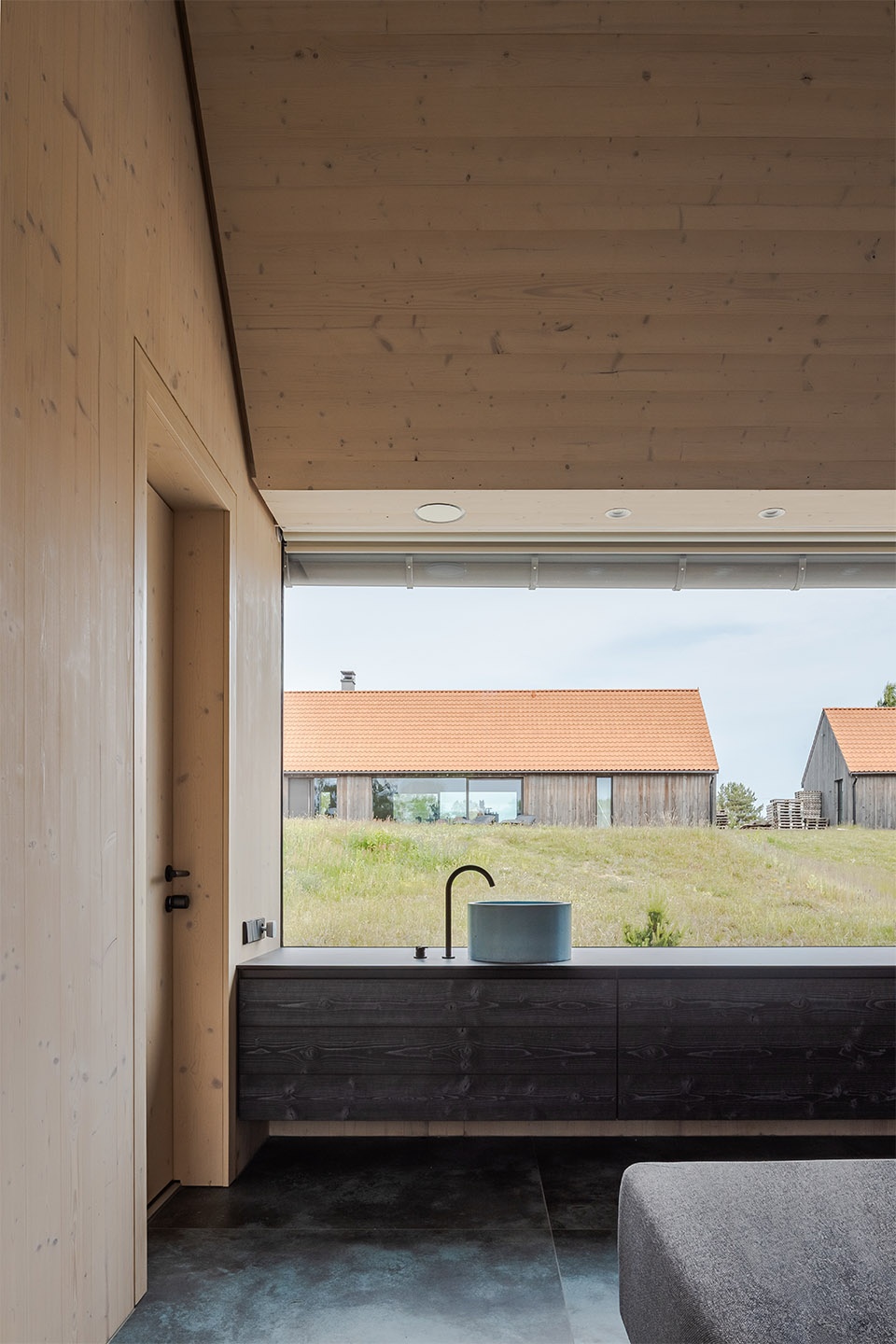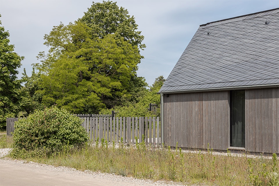 In the center of the building is a large space for private activities, to which the kitchen is connected at the northern end. The large space has the potential to merge with the outside space, opening a 10m wide window display to the courtyard, facing west. Along the street there are 4 bedrooms, grouped in pairs around two entrances from the courtyard. The building’s load—bearing wall structures are CLT and glued timber, the roof is in wooden structures with a natural slate covering.