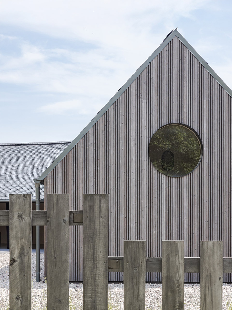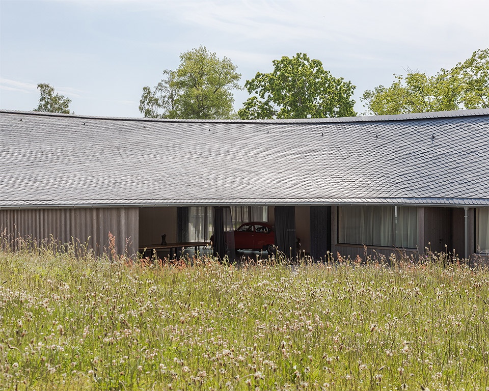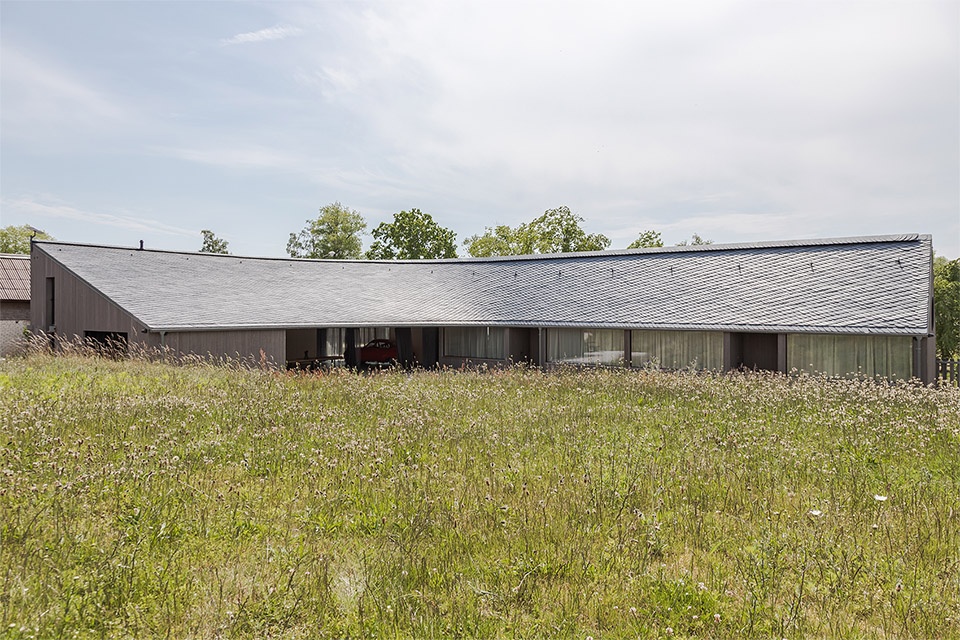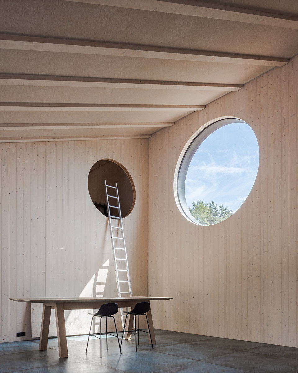 建筑的中央是一个供私人活动使用的大空间,厨房位于北端并与之相连。这个大空间开设有一个10米宽的、朝向西侧庭院的窗面,呈现出与外部空间微妙的融合趋势。住宅沿街设置了四间成对分布的卧室,并围绕两个从庭院进入的入口。建筑的承重墙结构采用了CLT和胶合木材,屋顶则采用木结构并覆盖天然石板。