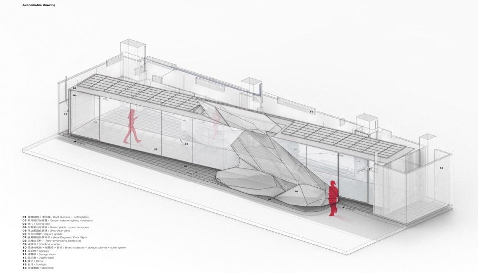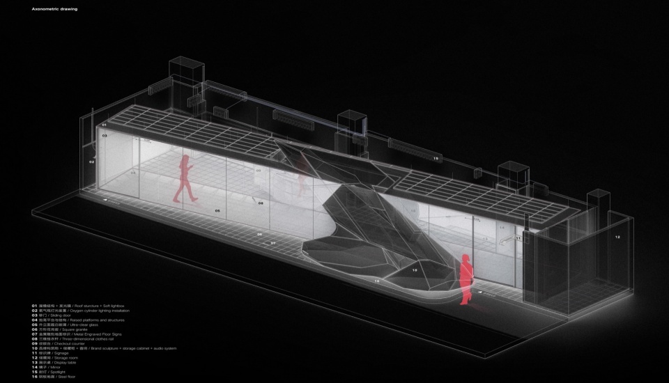 一个兼具展示、表演和传播功能的服装批发与零售场域,折叠于几何切割与虚实交错之间。