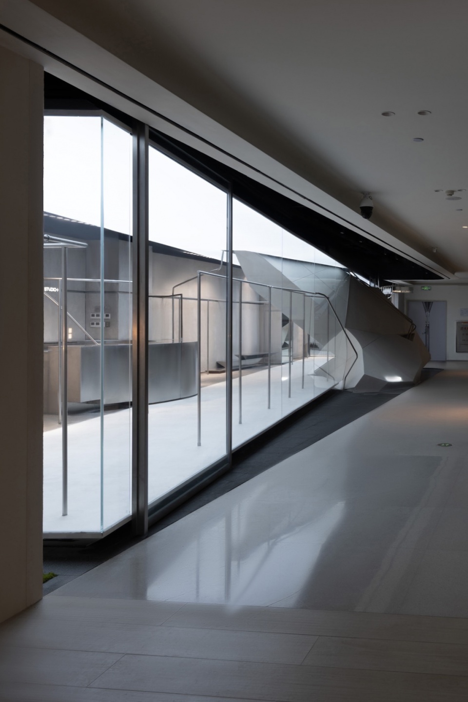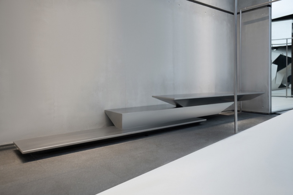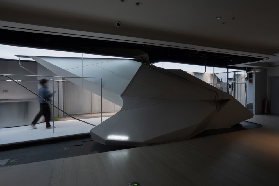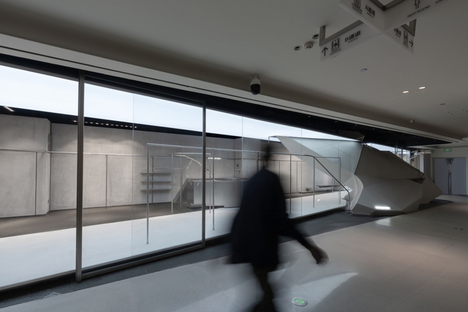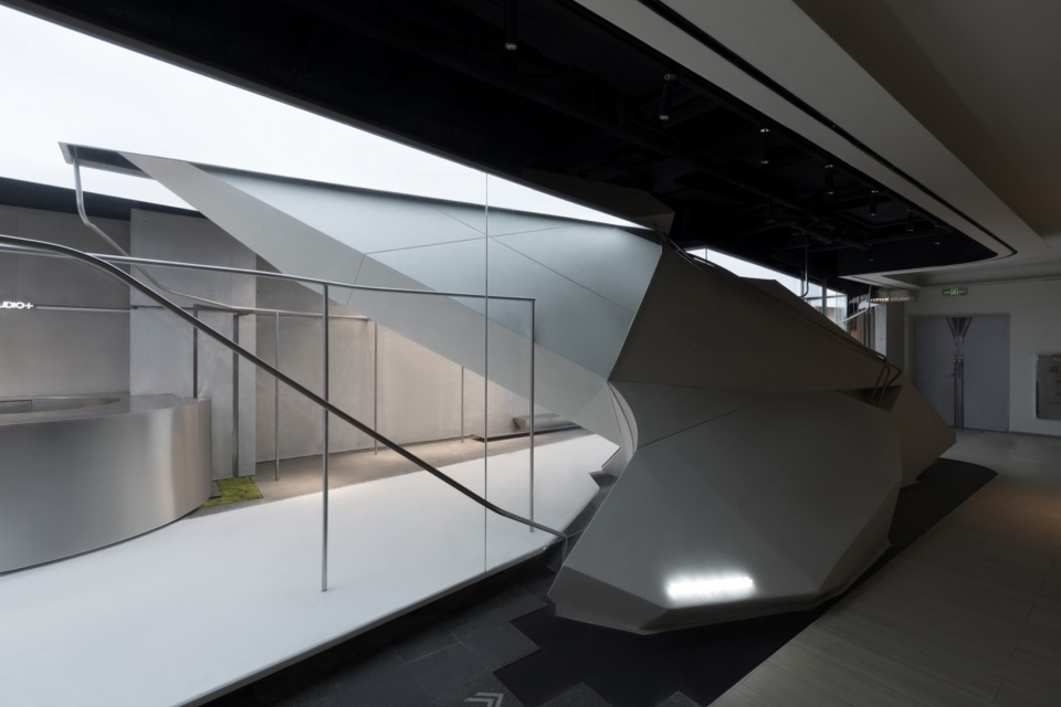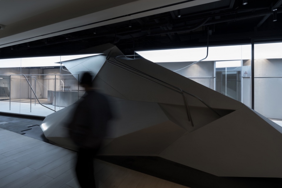At the core of the space is a huge geometric volume that seems to have burst into the interior from the outside. It is sharply cut into a polyhedral shape, like a fragment of a futuristic aircraft, forcefully intervening into the neutral space.