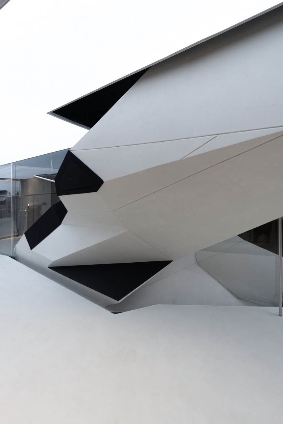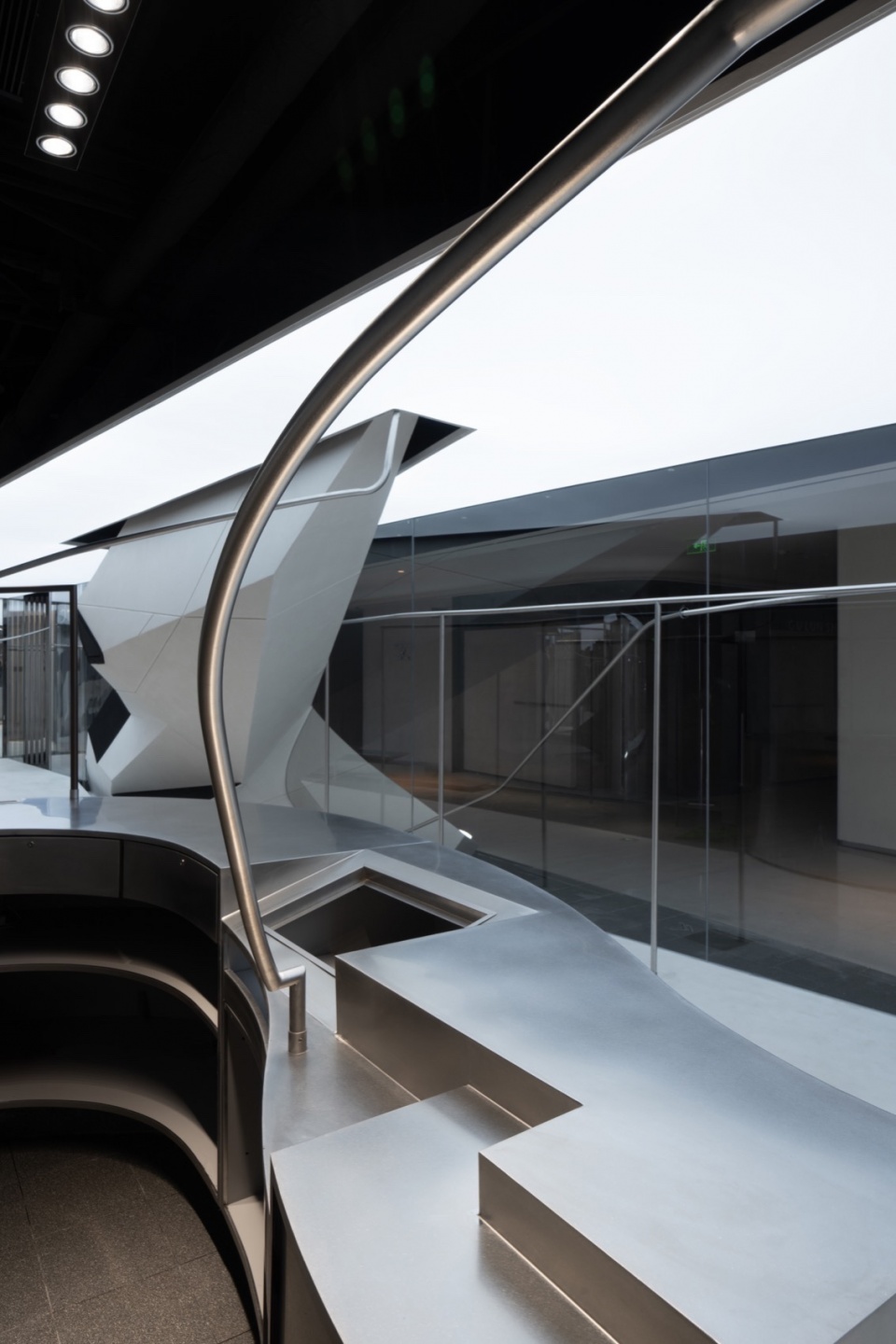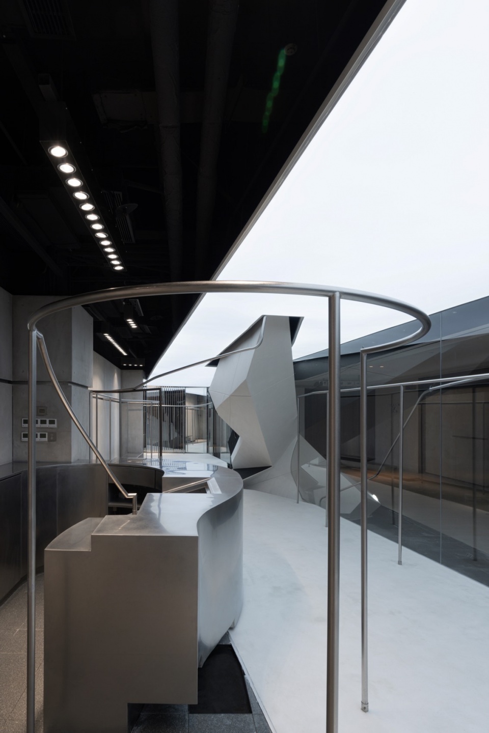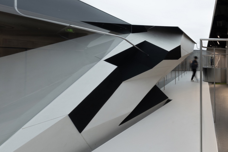 At the core of the space is a huge geometric volume that seems to have burst into the interior from the outside. It is sharply cut into a polyhedral shape, like a fragment of a futuristic aircraft, forcefully intervening into the neutral space.