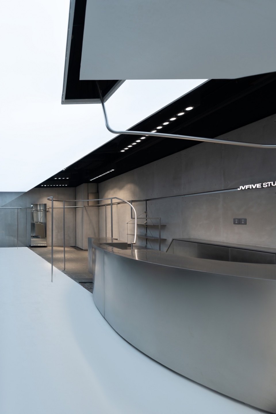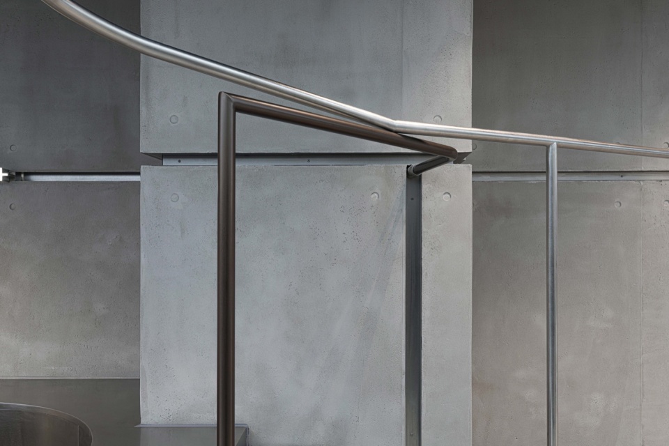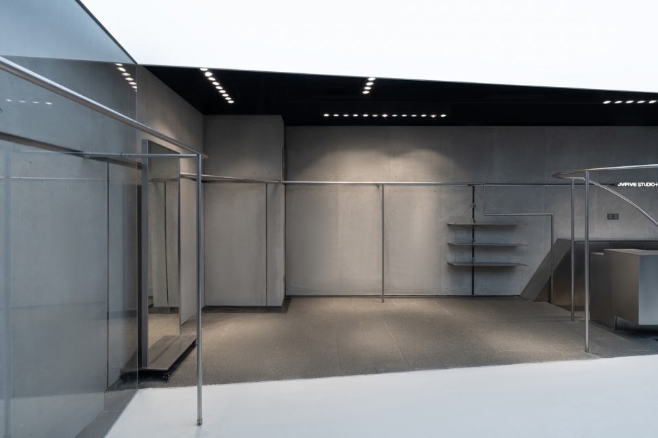 材质的对比为空间注入了冷峻的张力。核心几何构筑物采用灰白色石材表面,犹如被切割的巨石,以坚硬而纯粹的肌理成为空间的视觉核心。墙面由混凝土与镀锌板凹槽分割,呈现出粗粝与精致的并置关系。不锈钢管则贯穿全场,构成挂衣与分隔的系统性结构,赋予空间工业化的骨架感。芝麻黑地面以深沉的质感承托整体,使上方的服装与几何体更显突出。