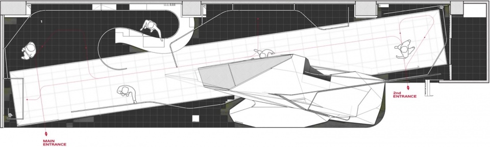 空间的核心是一块仿佛从外部闯入室内的巨大几何体量。它以锐利的折线切割出多面体形态,如同一艘未来飞行器的残片,强硬地介入原有的中性场地。