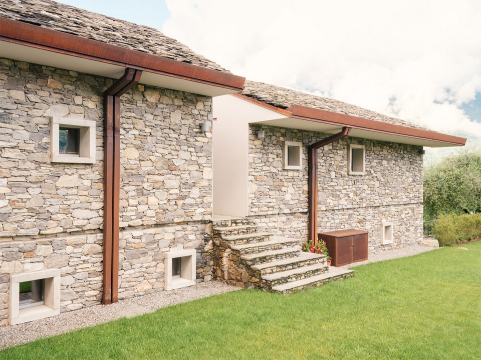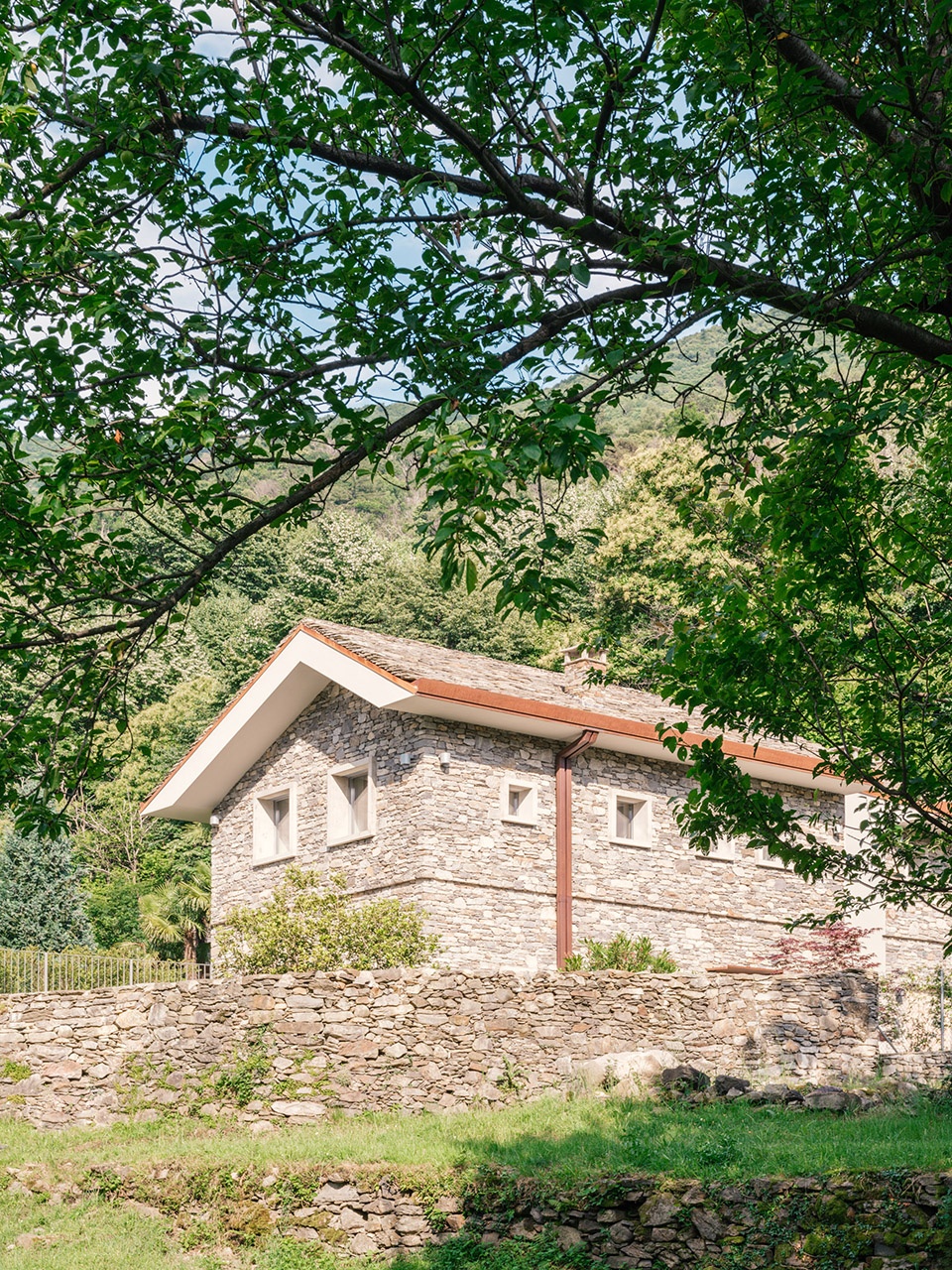 立面上两根双管状耐候钢雨水管垂直延伸至墙体三分之一处,穿过花岗岩墙面上的细微水平凹槽,使建筑体量在厚重中显得轻盈。厚檐的悬挑屋顶进一步稳固了建筑的视觉重心。如今,Le Stalle以当代设计重新诠释了“庇护所”的概念——在这片林木茂密、坡势陡峭的伦巴第山区,它重新成为牧人及其羊群的避风之所。