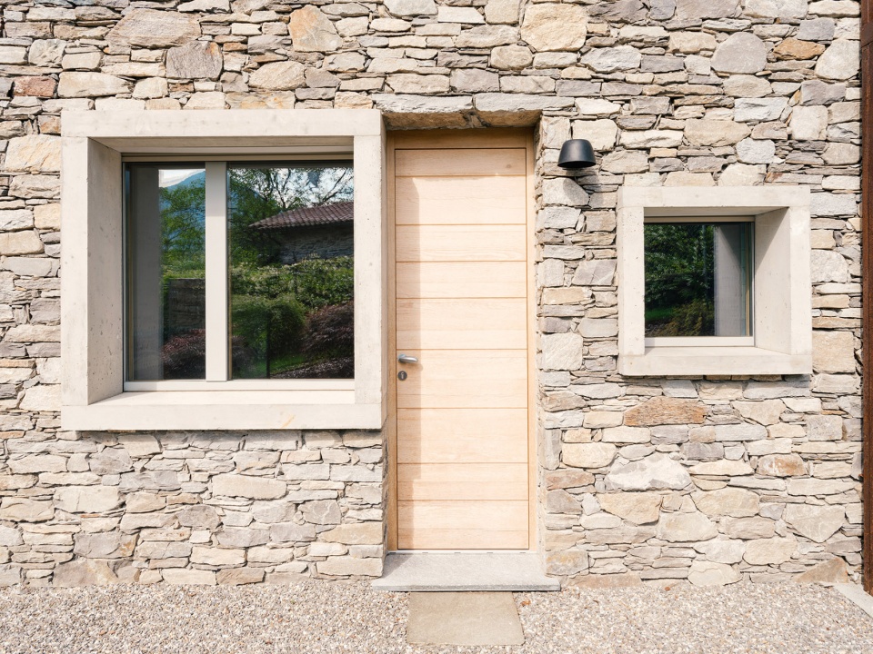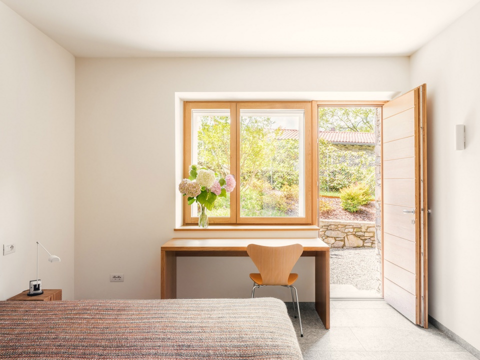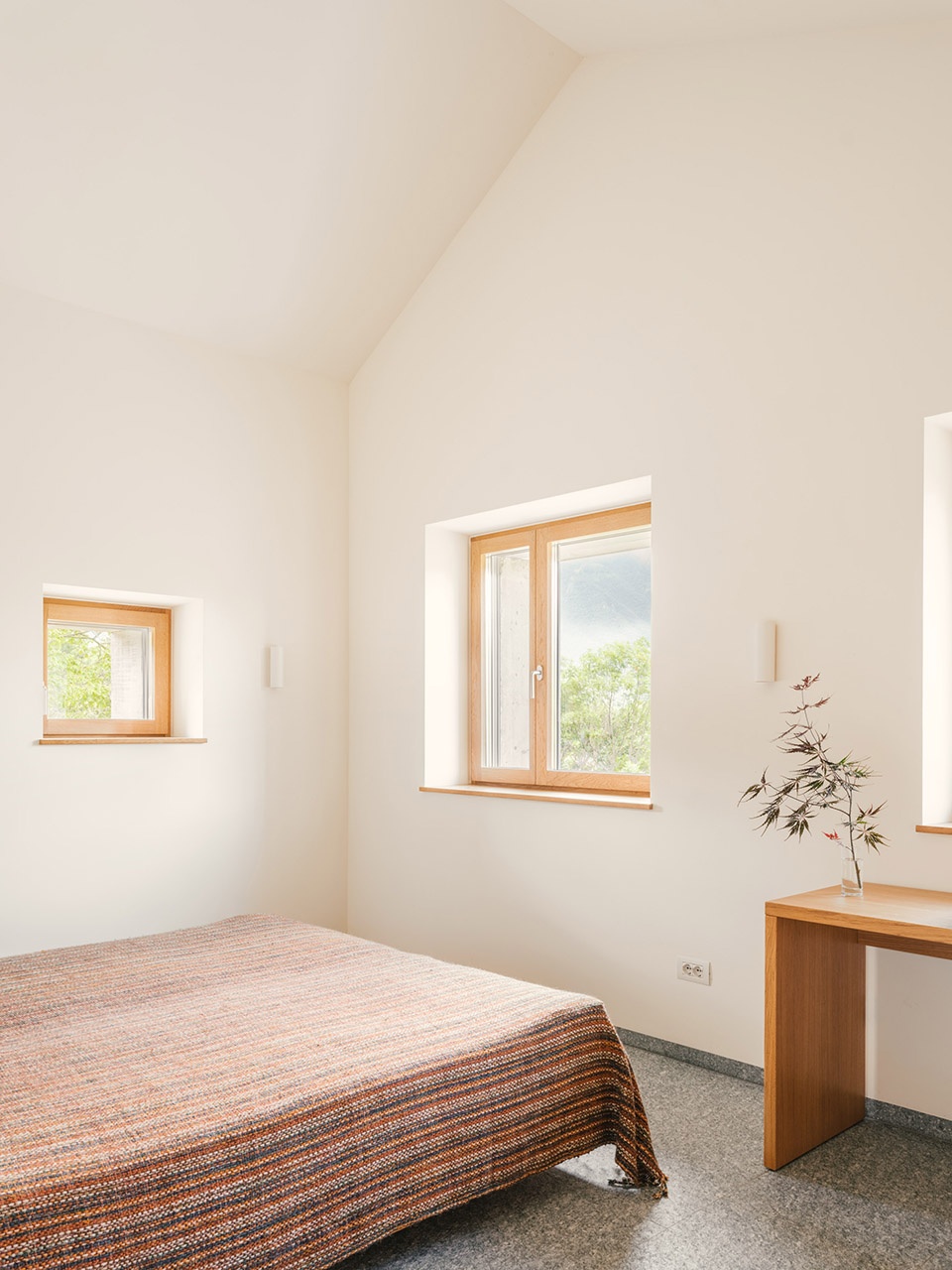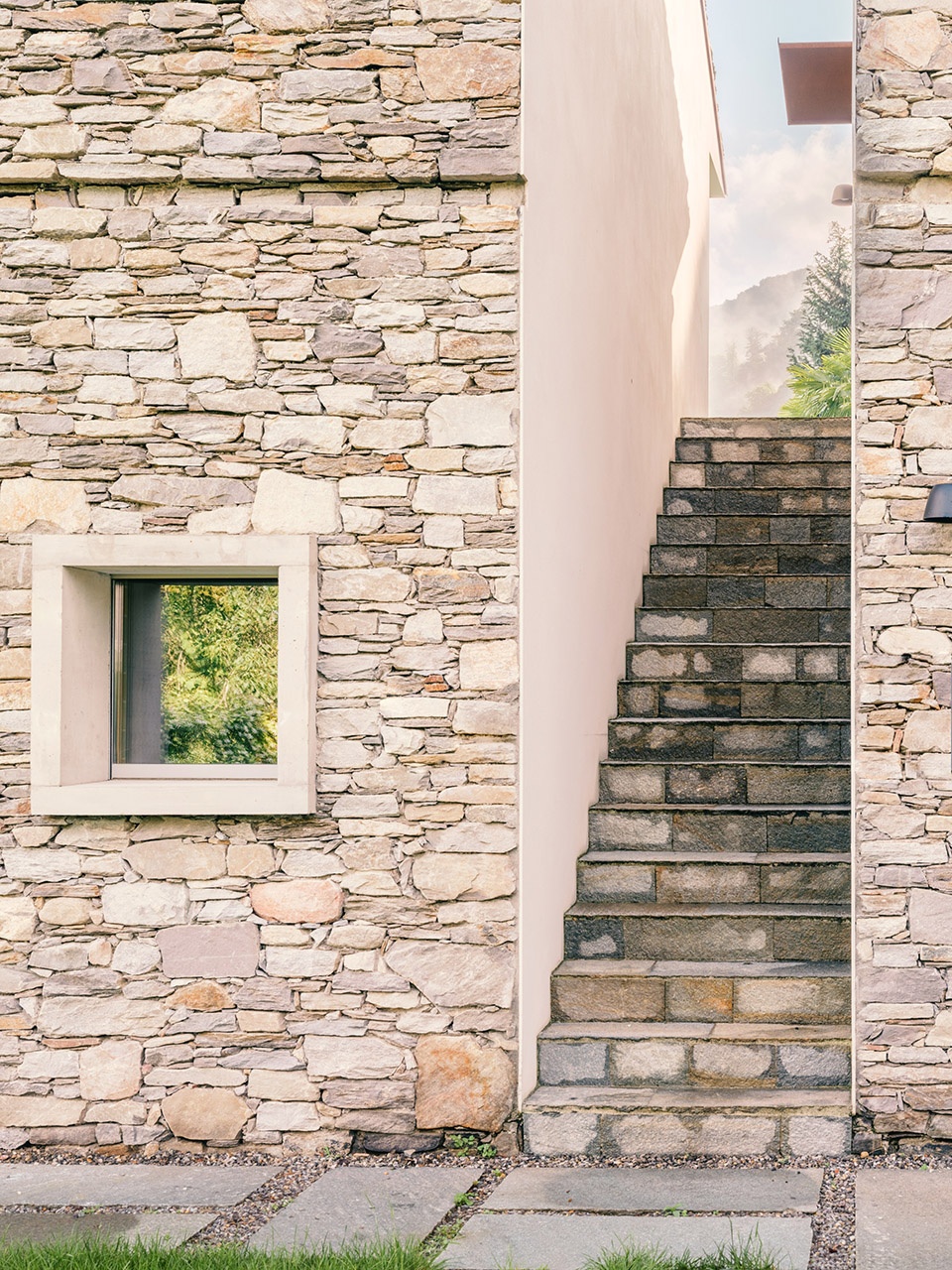 新的石墙使用从废墟中回收的石块砌筑而成,延续了古老的质感。但——如何让这些古老的石头说出当代的语言?为了在历史中引入新的光线、让内部空间更加明亮,Pedro&Juana 在墙体上穿插了厚重的混凝土窗框,以框取意大利的自然风景。其中一扇窗正对山巅教堂的钟楼,另一扇则捕捉了林间的片段。这些窗景宛如动态的画作,随着人从餐厅、卧室到厨房、露台的移动而不断变换视角——直到在露台上,人被阿尔卑斯山峰变幻的色彩与周围植物被阳光温暖的气息所迷醉。
