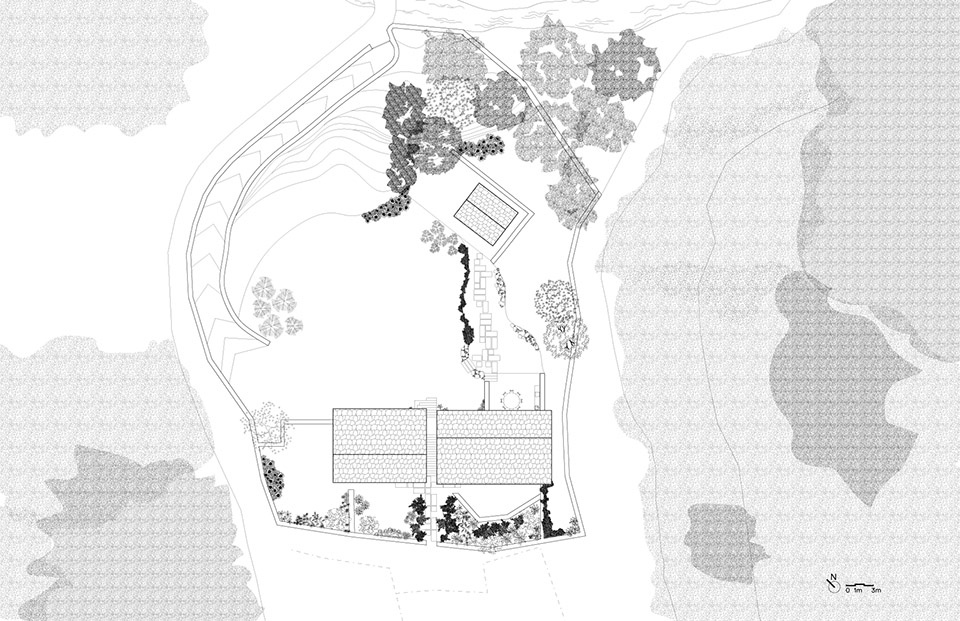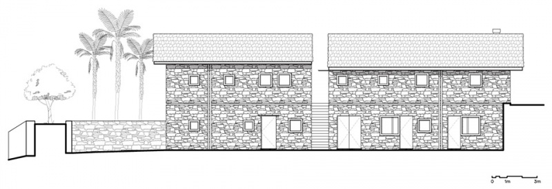 “Le Stalle”——一座位于意大利马焦雷湖(Lago Maggiore)附近乡村的马厩遗址,只能通过一条古老的罗马石板路抵达。业主委托Pedro&Juana将这座破败的旧马厩改造为两栋度假住宅。虽然原建筑因长期暴露而无法修复,但意大利的文物保护法规要求新建筑必须尊重原有的建筑基址,同时允许最多20%的扩建。在这样的限制下,为了向其历史致敬,Pedro&Juana保留了马厩坚实的矩形体量(扩大20%),延续其厚重的石砌墙体,并将整体一分为二,在两栋房屋之间创造出一条视觉上的“缝隙”。两栋坡屋顶的板岩体量朝不同方向倾斜,仿佛后方的那一栋正探头窥视着下方五百米处闪烁的湖面。