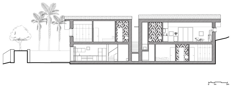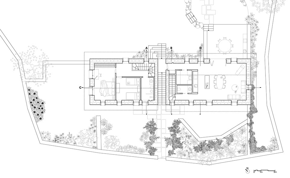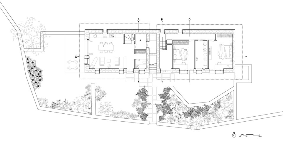 由于建筑依山而建,Casa A与Casa B均为两层结构。中央的分隔体量容纳了一条通向上方花园与Casa B上层入口的楼梯。郁郁葱葱的花园与石质外观形成鲜明对比,这种对比关系也延续到了室内。每栋房屋都有独立的色彩主题,从厨房台面、橱柜到浴室均有所呼应。尤其是浴室空间,细腻的设计与从地面延伸至天花的亮丽彩色瓷砖,为居住者带来了放松与愉悦的体验。