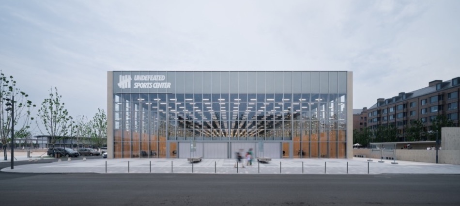 北立面为一整面落地玻璃幕墙,将体育中心内部活动完全暴露于外,同时也将外部景观与社区公共活动纳入视线之中。幕墙中央设有两扇总宽18米的大门,打开后,社区人群可不经过门厅,直接进入篮羽馆及相关区域,使体育中心具备可变的社区使用潜力,强化其对外开放的可能性。