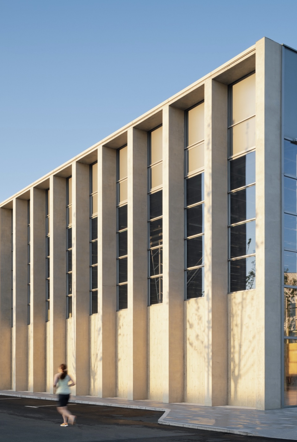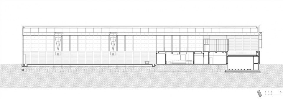 The completed sports center is a large, monolithic volume in the form of a rectangular box, measuring 78.2 meters in length, 35.5 meters in width, and 12.7 meters in height. The full-height space on the north side of the plan accommodates the basketball and badminton hall containing two indoor basketball courts. The south side features a mezzanine level. The lower level of the mezzanine houses the sports center’s lobby, jiu-jitsu classroom, changing rooms, and the water treatment plant room for the indoor swimming pool. The upper level of the mezzanine contains a fitness gym that overlooks the basketball/badminton hall and the indoor swimming pool; both spaces offer a bird’s-eye view of the hall below, creating a spatially responsive layout.