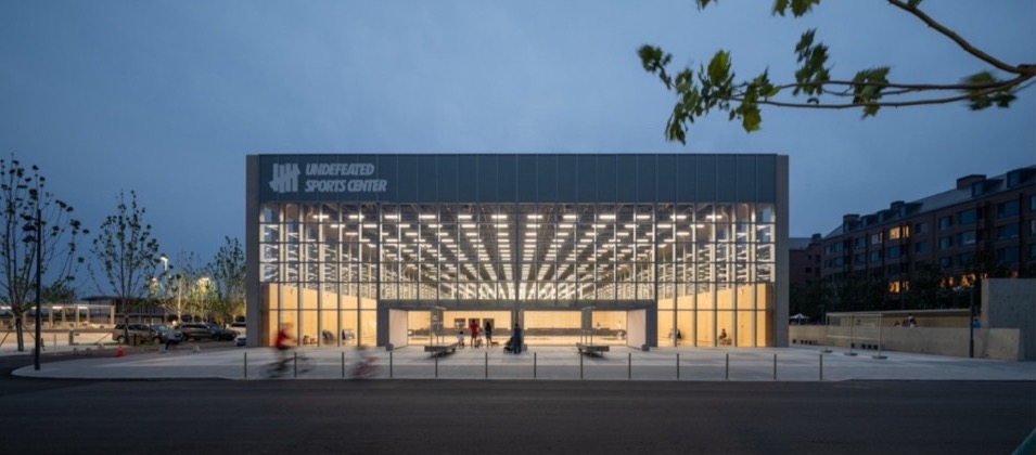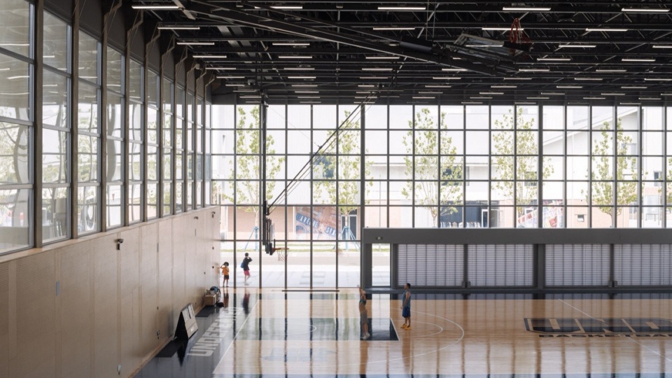 The north elevation is a full-height glass curtain wall, fully exposing the internal activities of the sports center to the outside, while also incorporating the external landscape and community public activities into the interior view. The central part of the curtain wall features two large gates with a total width of 18 meters. When opened, community members can directly access the basketball/badminton hall and related areas without passing through the lobby, giving the sports center variable potential for community use and strengthening its openness to the public.