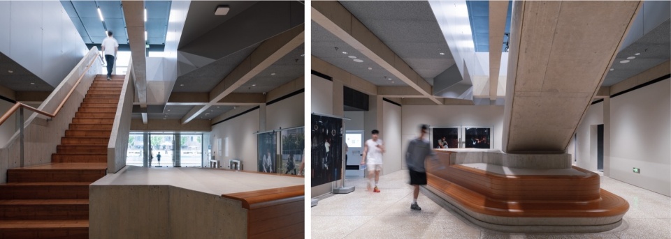 The lobby is situated on the west side of the sports center, accessed through the outdoor swimming pool area. The lobby is 20 meters long and 9 meters wide. Although compact, it serves as the most crucial circulation hub of the sports center. The entire lobby employs a roundabout layout. After entering from the west side, users can circulate around the central “island” to access four directions: north to the basketball/badminton hall, east to the jiu-jitsu classroom, south to the changing rooms leading ultimately to the indoor pool, and upwards via stairs to the fitness gym on the mezzanine. The central roundabout area features a raised base for the stairs and incorporates public benches, facilitating waiting and short breaks, thereby enhancing the social attribute of the space.