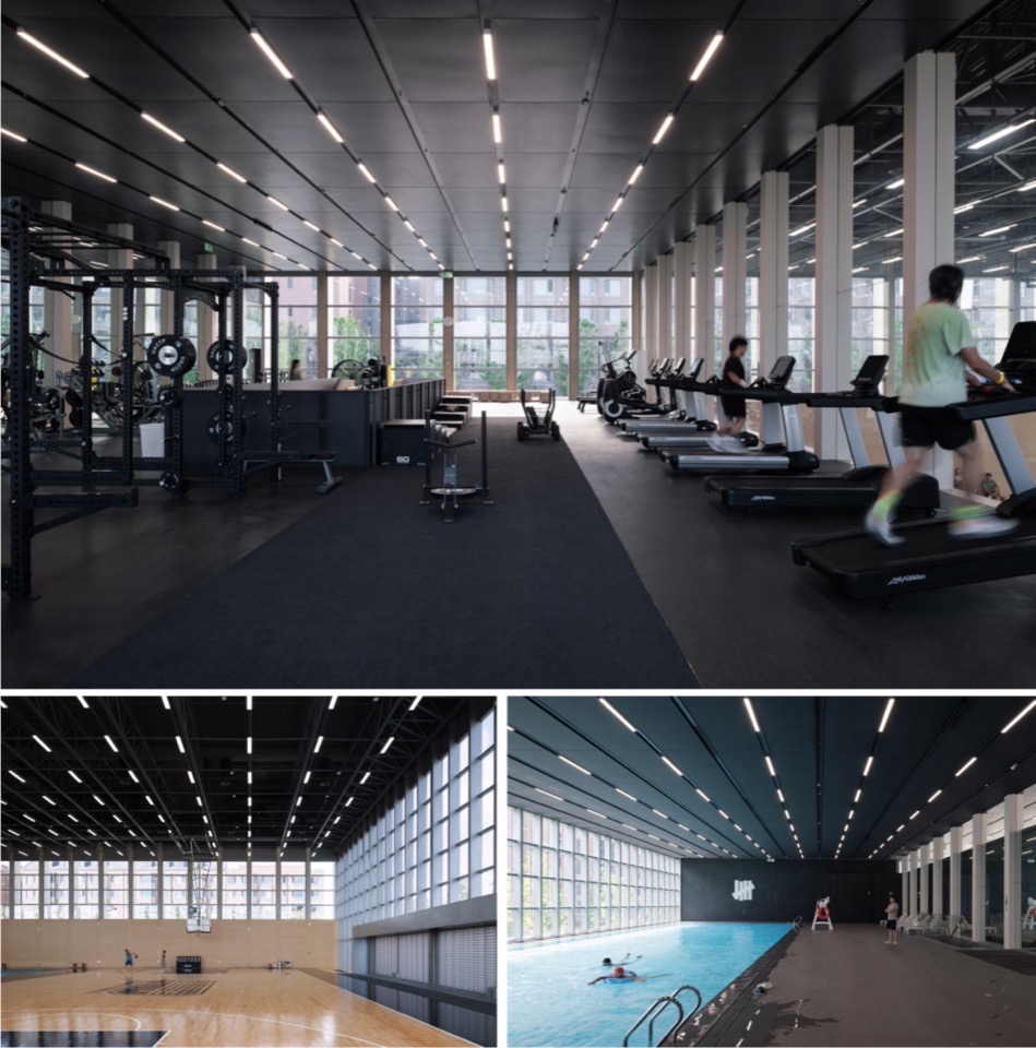 The two rows of internal columns separating the basketball/badminton hall, fitness gym, and indoor swimming pool do not bear the roof load; they solely serve as fixed frames for the glass curtain walls and internally conceal a total of 12 roof rainwater pipes. Externally, the cross-sectional dimensions of these columns match those of the main structural columns, visually enhancing the overall rhythm and layering of the facade. A unified lighting system is employed across the roof. The ceiling in the basketball/badminton hall is exposed, while the fitness gym and pool areas have suspended ceilings. The unified lighting fixtures and service trunking layout allow the suspended ceilings to form a complete and continuous overhead plane.