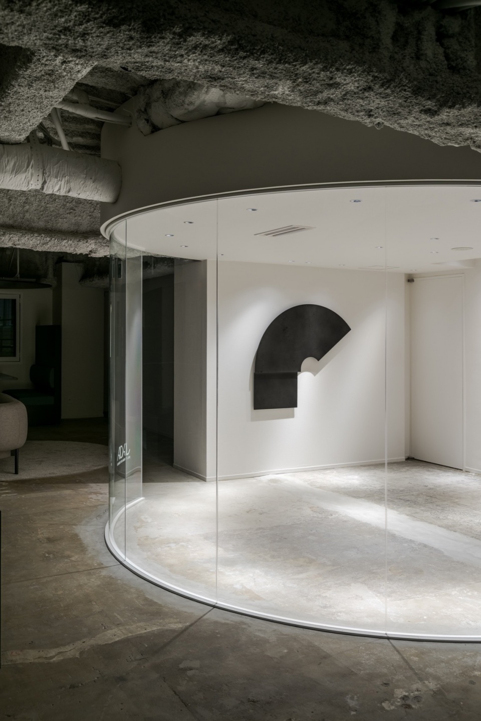 原有室内空间的特征是连续排列的小窗,但由于天花高度较低,并覆以岩面板材,梁体形态外露,使空间呈现出一种粗粝而富有表现力的特征,却难以称作舒适的工作环境。