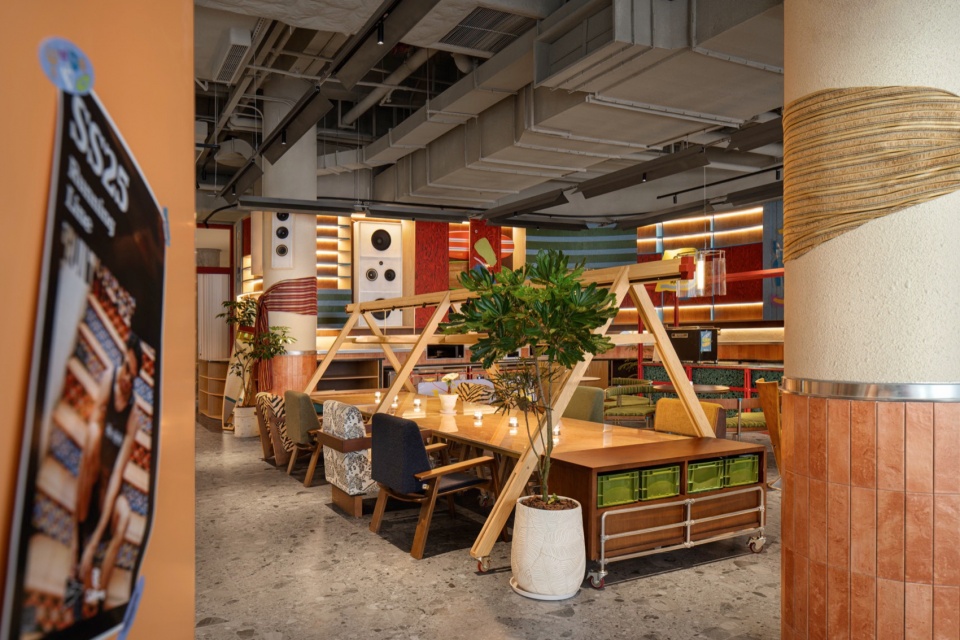 The outdoor seating area encourages relaxation with varied seating arrangements, including circular benches for spontaneous gatherings and skateboard-style stands, fostering an atmosphere of free-spirited ease.