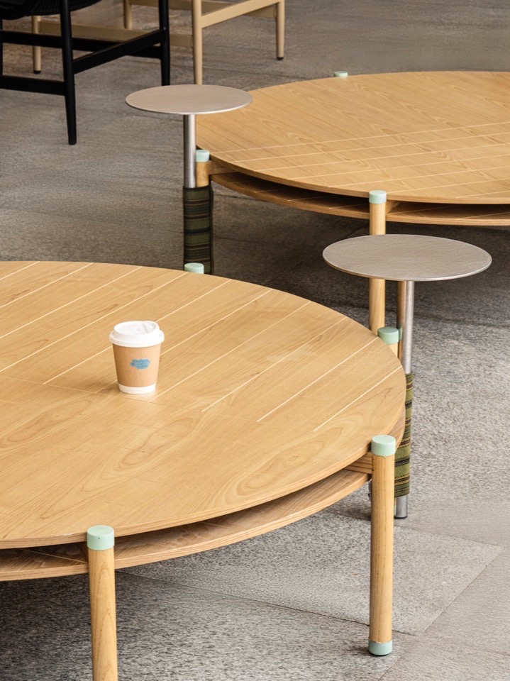 正门的外摆使用多种不同状态的座椅方式,中间的圆椅使用中心环坐的方式表达随停随坐的松弛状态,加上滑板站台,整体外摆呈现出自由自在的松弛感。