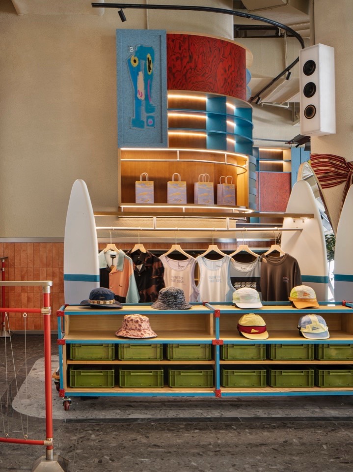 靠商场内的入口处为零售区,前方是使用蓝、红色的铝方管连接器加上万向轮组合而成的饰品区;后方的服饰区域,使用了两块呈45° 角度的冲浪板链接钢架作为衣架杆,加上吧台与吊柜延伸出来的收纳区域,再使用冲浪板形状的试衣镜,形成一个丰富多彩、轻松亲昵的零售氛围。