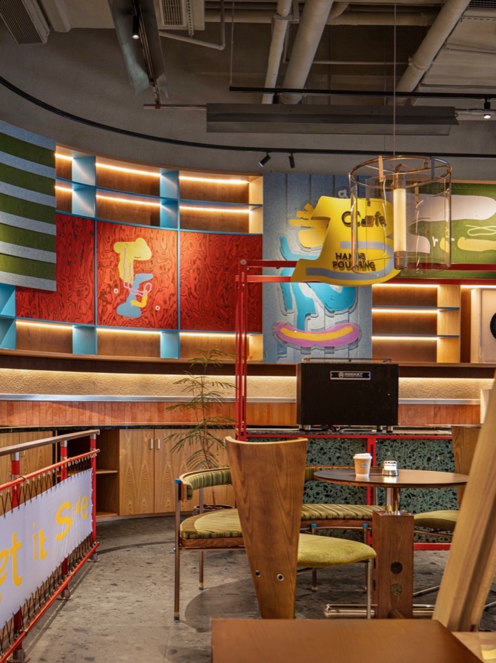 Boooard的空间整体是流动开放的,布局上使用环形动线,大量使用弧线的动线让空间更流畅,我们使用一条长型单边户型吧台加上背部立面的大型吊柜成为空间的主体和中心;再以入门处室内外衔接处的背靠背长椅与吧台前的区域、三角形的大长台为空间内的三个实体支点,形成整个场的虚实关系和层次感。