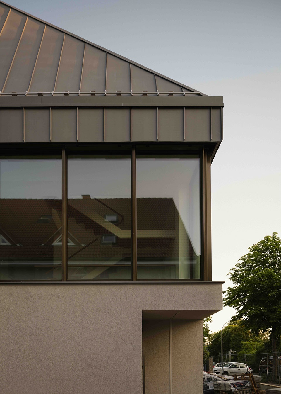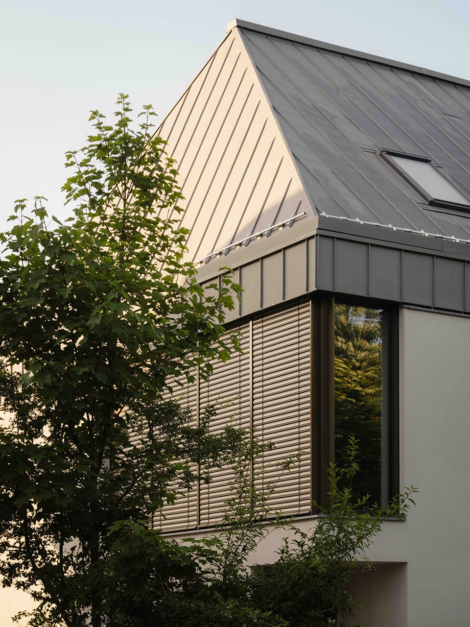 The new folded roof is characterized by large dormers and an expansive window front on the garden side. Due to the central positioning of the dormers, the roof edges remain visible and are thus cleverly integrated into the geometry of the house. In addition, the vertically structured sheet metal panels respond harmoniously to the existing building. They calm the radical design intervention and cleverly combine old and new. A special detail is the interface between the roof and the facade. Normally, the eaves are located much higher on the house, with the wall extending below the roof. By demolishing the existing ceiling, the rain gutter was elegantly incorporated into the eaves. The new eaves wrap sculpturally around the existing buildings volume.