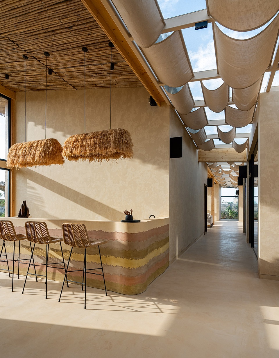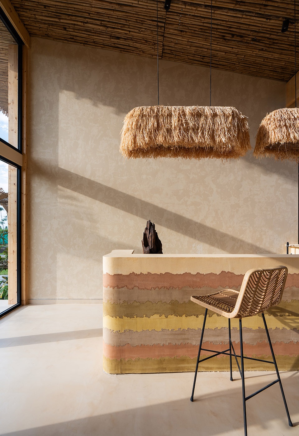 前台是感官体验的起点。空气变得凉爽,柔和的光线渗入,触感与脚下的质地都保持着原始的粗粝。一个用夯土打造的前台低调地立于空间中央,色调沉静。常见的椅子被两段巨大的木头所取代,它们既是座椅,也是随光影变幻而不断变化的雕塑元素。这些木材饱经岁月却仍充满触感,为空间赋予了任何光亮家具都无法给予的厚度。竹片覆盖的屋顶在白日不断过滤光线,在微水泥地面上投下变幻的纹理,让室内的每一个瞬间都独一无二。