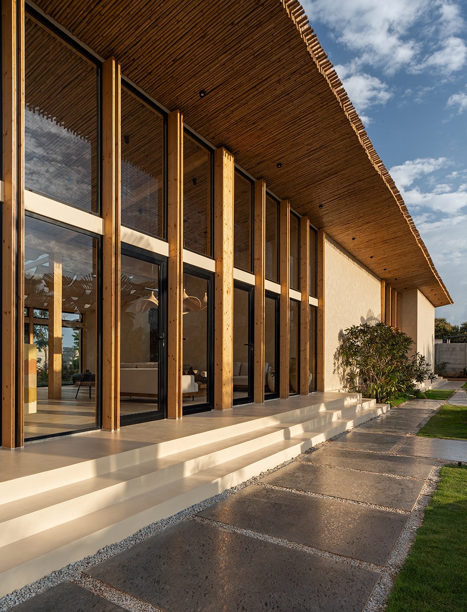 The bamboo-clad facade filters light throughout the day