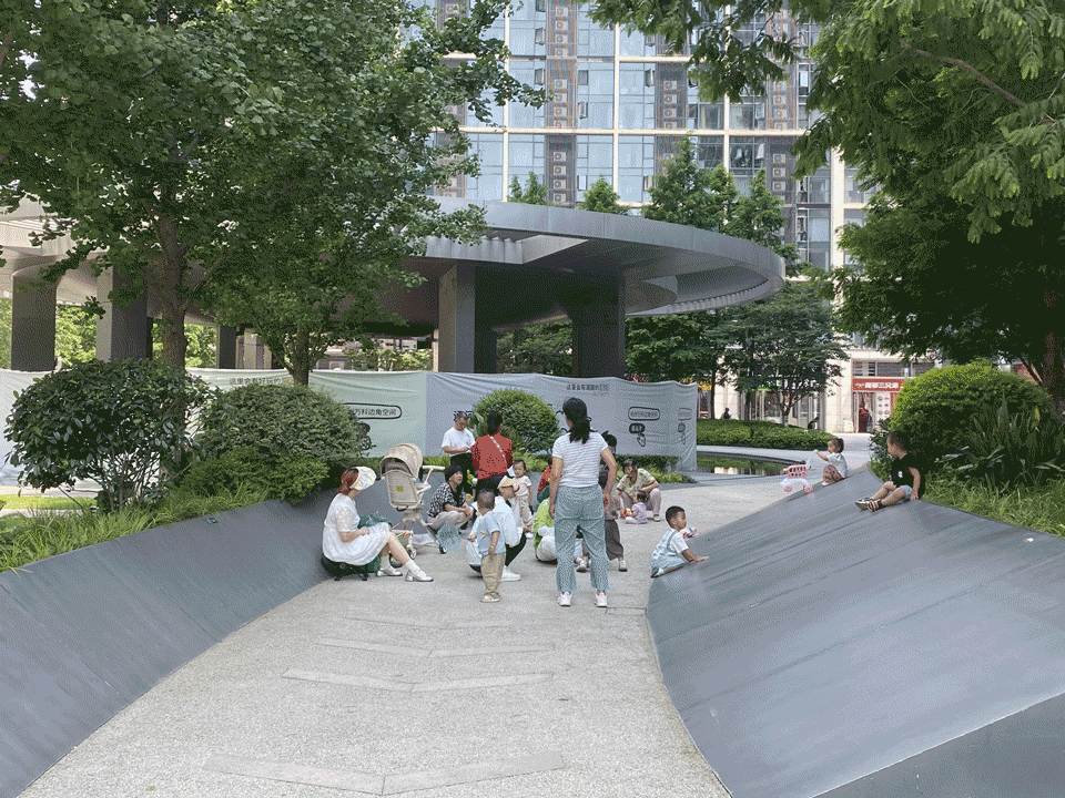 有趣的是,凉亭一侧、与之相对的公园小径和绿化斜坡,则因尺度宜人、被树丛环绕的自然氛围地形吸引了更多社区居民:孩子们在斜坡上奔跑玩耍,大人们随意落座小憩,这里成为园区生活的一处微妙重心。