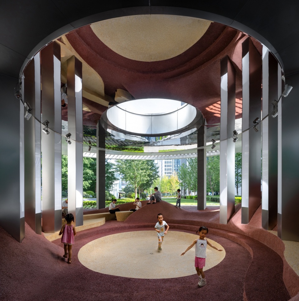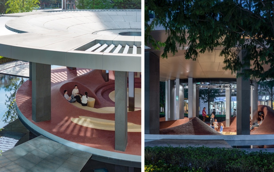 Now, the pavilion features a pleated, undulating landscape that fosters a genuine, organic connection between the body and space—far beyond the function of a simple “play structure.” The pleat itself represents an “in-between” space—a zone of freedom, intimacy, and blurred boundaries between inside and outside. This landscape redefines the 18-meter circular pavilion into two spatial layers: a central, stage-like area for gathering, and a more intimate outer ring. Here, the folds extend naturally outward, forming a series of cozy, human-scaled pockets that invite people to stop, rest, or play. Though seemingly open, the landscape subtly nurtures closeness through its flowing forms and partial enclosures, quietly enabling chance encounters and spontaneous moments.