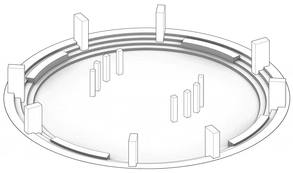 In addition to the landscape intervention, we reimagined the pavilion’s existing structure by introducing a mirrored ceiling that reflects and complements the forms below. The undulating ground evokes a mountainous terrain—natural forms that have long drawn people together. Within the pavilion, the relationship between heaven, earth, and humanity is poetically condensed into one shared space. This mirrored “sky dome” encourages visual interaction between people and their environment. It reflects the shifting sky and sunlight, guiding the rhythm of bodily movement. The landscape invites both motion and stillness, and as the mirrored ceiling transforms with the light, the human experience evolves in response. This is a space to be explored, felt, and understood through the body.