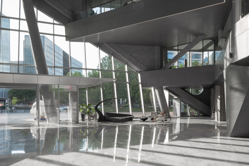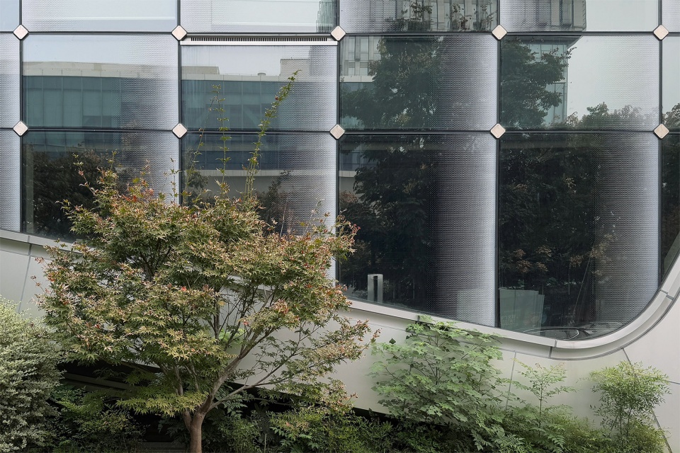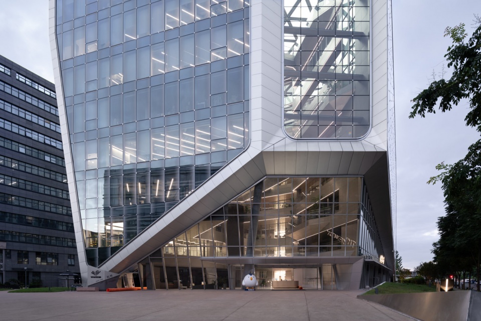 建筑立面用阳极氧化铝板表达结构骨架。幕墙设计中,通过定制菱形夹具固定玻璃的方式实现隐框效果,精巧的菱形夹具配合玻璃的渐变肌理,让连续的大面积立面产生有节奏的变化,隐藏式通风器解决无开启扇下的空气流通问题。这些都是为了实现建筑立面的极致平滑与纯净。建筑充满未来感的形式、用材、细节,回应了科技企业的先锋性与独特性,让建筑在环境中“独树一帜”。