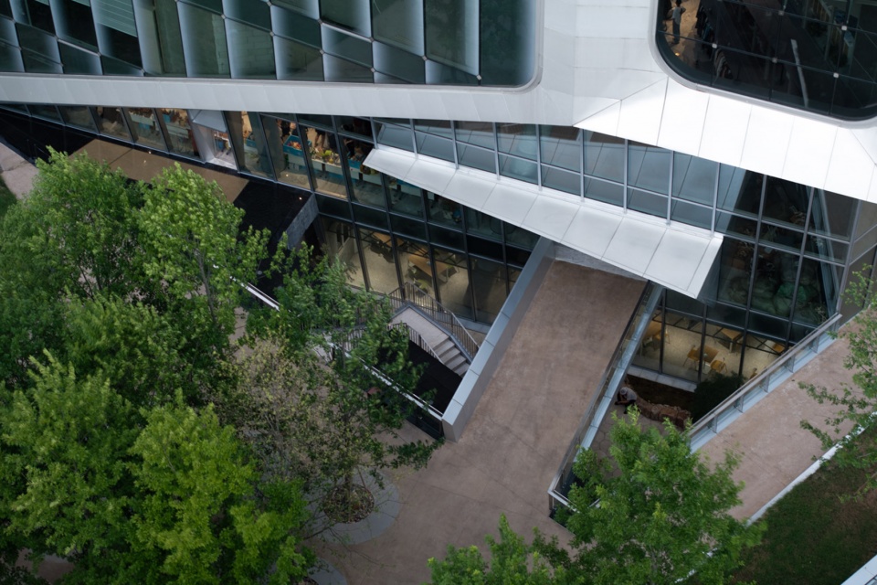 On the north side, the building steps back from the boundary and features a cantilevered volume, creating a spacious main entrance plaza. This plaza serves not only as an outdoor hardscape for corporate gatherings but also as a small public square that aligns with the street scale for urban users.