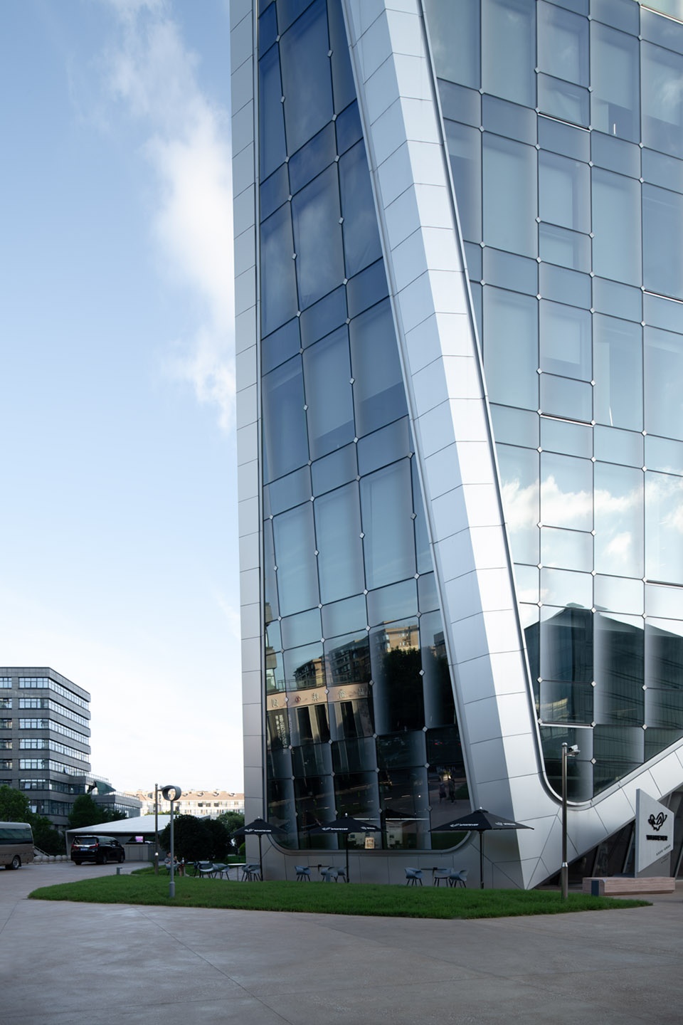 The facade uses anodized aluminum panels to express the structural framework. In the curtain wall design, custom diamond-shaped clamps secure the glass to achieve a frameless effect. The delicate clamps, combined with the glass’s gradient texture, create rhythmic variations across the large continuous facade. Hidden ventilators address airflow issues without visible opening sashes. These measures achieve an exceptionally smooth and pure facade. The building’s futuristic form, materials, and details reflect the pioneering and unique nature of the tech company, making it “stand out” in its environment.