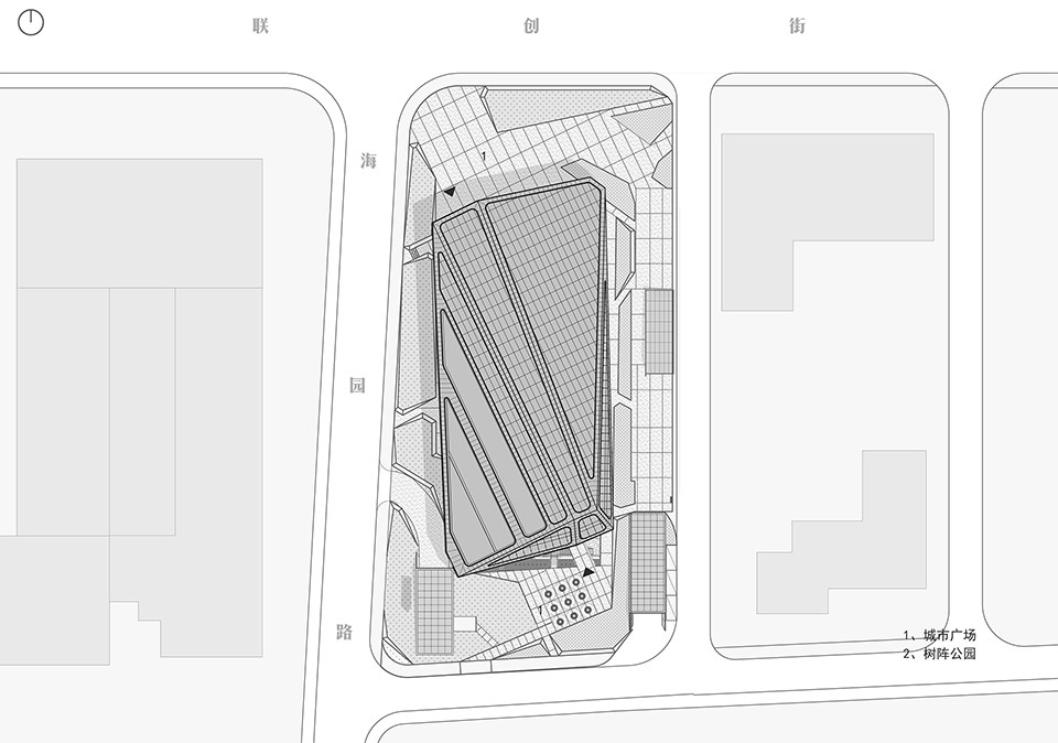 建筑北侧通过边界退让与体量倾斜出挑的方式,形成最大尺度的主入口广场,主广场不仅为企业集会活动提供户外硬质场地,也作为与街道尺寸契合的城市公共小广场为城市使用者所用。