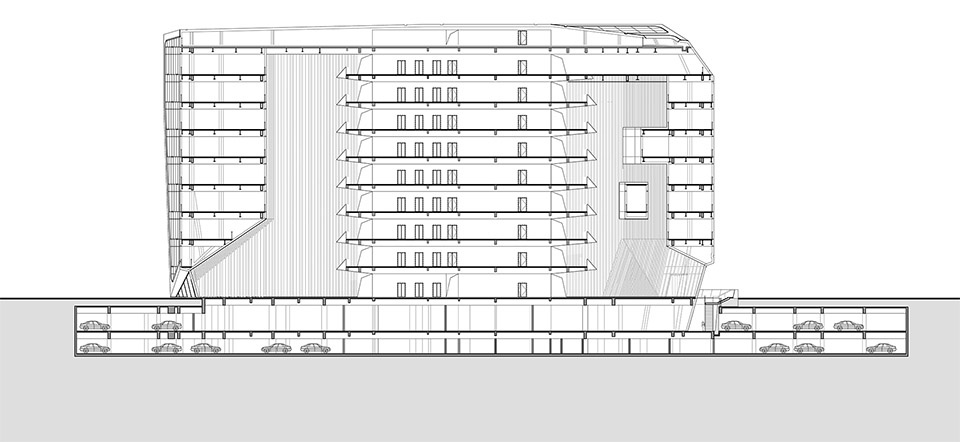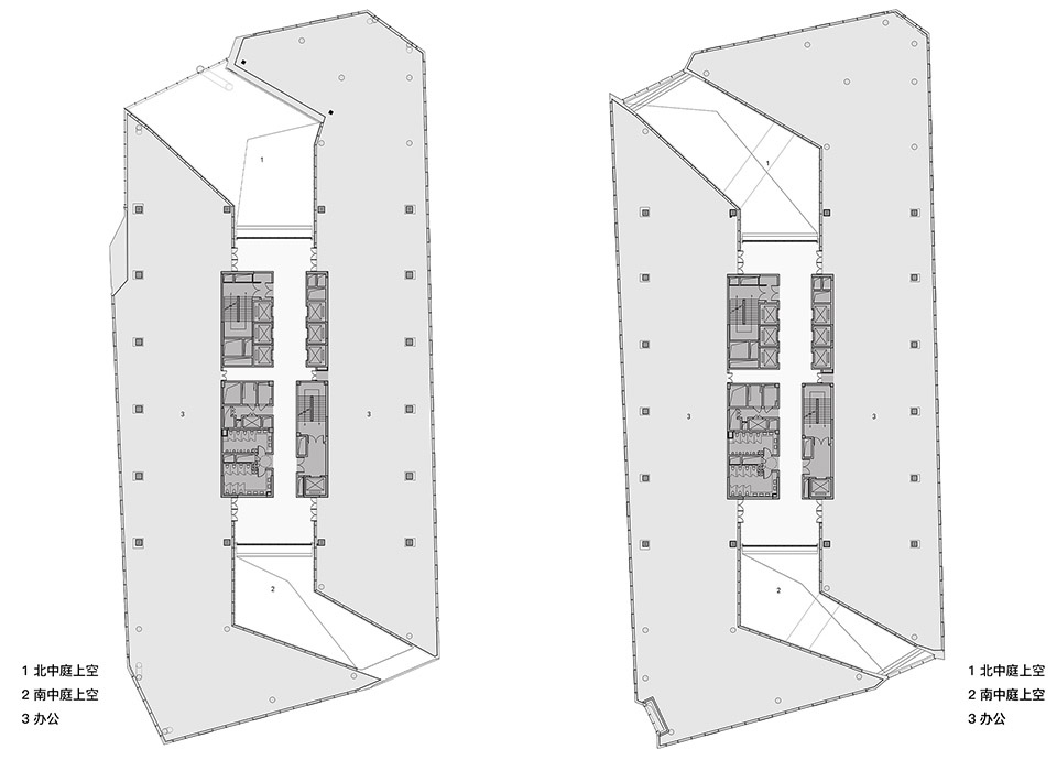 建筑首层布局商业、餐饮与少量办公,从空间、形式到功能,进一步强化建筑的公共性与开放性;2-8层是可根据现实使用需求灵活隔断的办公区;9层作为接待、展示及会所,并在面向城市公园的西南角布置空中观景露台。