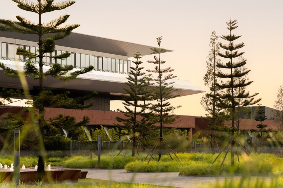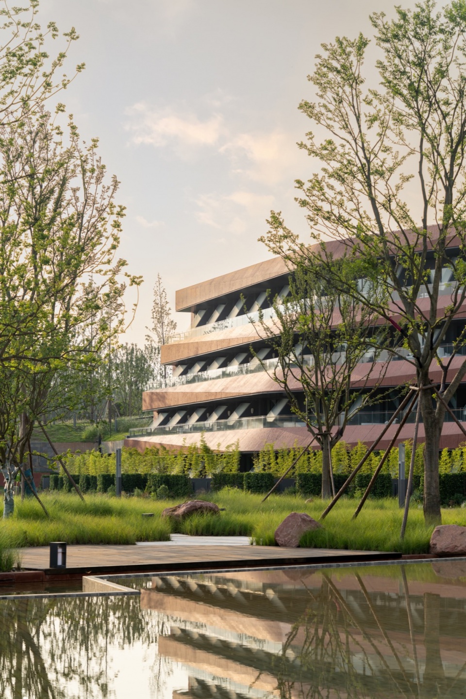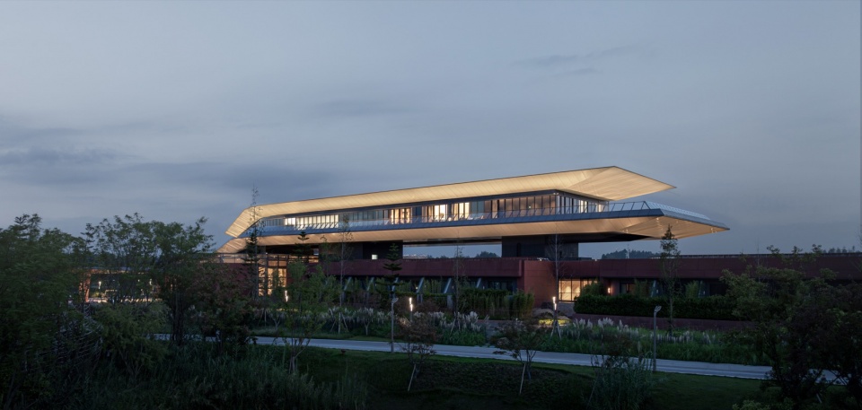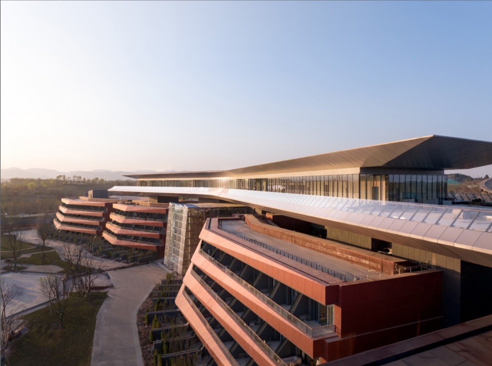 通过下沉的方式,酒店与场地、环境深度融合;酒店不再是一个突兀的“外来者”,而是成为了整个园区水环境的一部分。酒店与滨河景观、绛溪河、瀑布、绛霞湖融合在了一起,形成一个层次丰富的世园会观景序列。这是我们对 “建筑与自然共生”理念的一次身体力行。